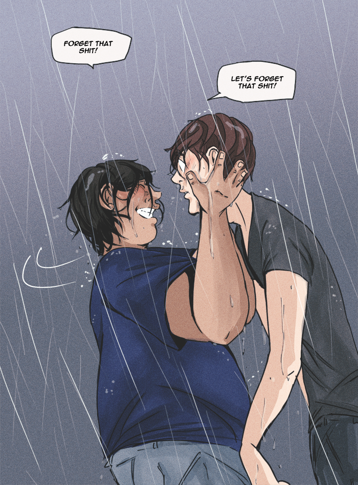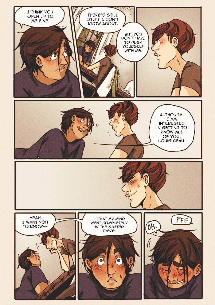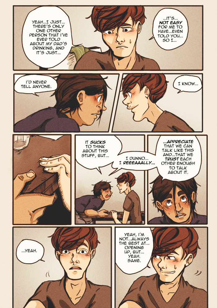 Content warnings: profanity, innuendos and characters talking about sex, some references to underage drinking, discussion of bullying/self-harm/substance abuse/alcoholism/mental illness, and the graphic representation of anxiety/panic attacks. Other topics include death, emotional/verbal abuse, and therapy.