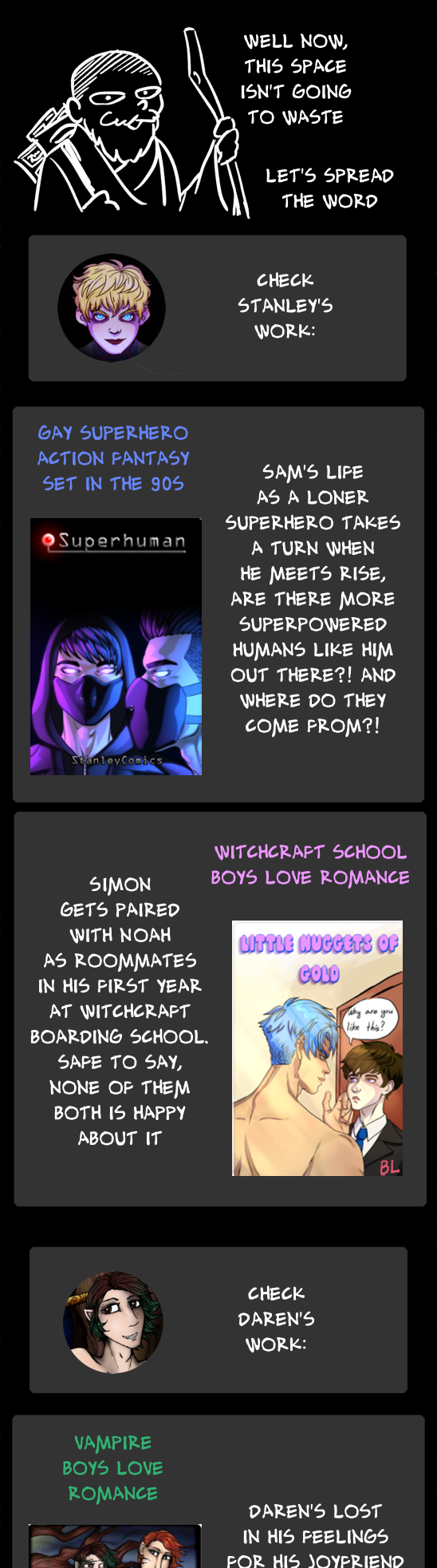 The links as promised :) My comic update: https://undersatyrsorders.thecomicseries.com/comics/3#content-start Gay superhero action comic: https://tapas.io/series/Superhuman1/info Witchcraft school BL comic: https://tapas.io/series/Little-Nuggets-of-Gold/info Vampire BL comic: https://tapas.io/series/Shadymeadows/info