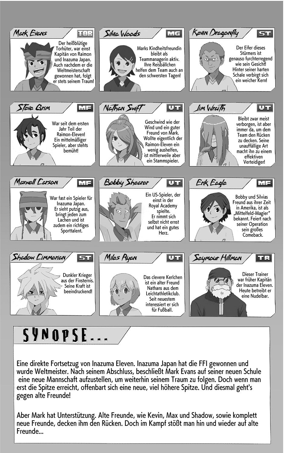 Eine direkte Fortsetzung zu Inazuma Eleven 3. Mark Evans, Kapitän von Raimon und Inazuma Japan, gewann die Football Frontier International und wurde mit seinem Team Weltmeister. Ein Jahr verging und nach seinem Abschluss beschließt er, in seiner neuen Schule ein Team zu gründen, um weiterhin den Fußball zu spielen, den er liebt. Wenn jemand die Spitze erreicht hat, ist der einzige Weg, um stärker zu werden, wieder von Anfang zu beginnen. Und diesmal geht's gegen alte Freunde!