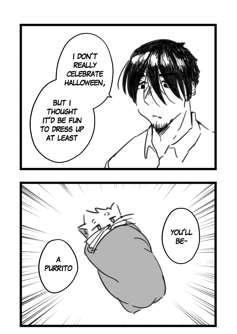 low budget costume for you and your furry friend also i think he doesn't know what a purrito is, he just accidentally made it up with his dad joke twitter @poisonicpen