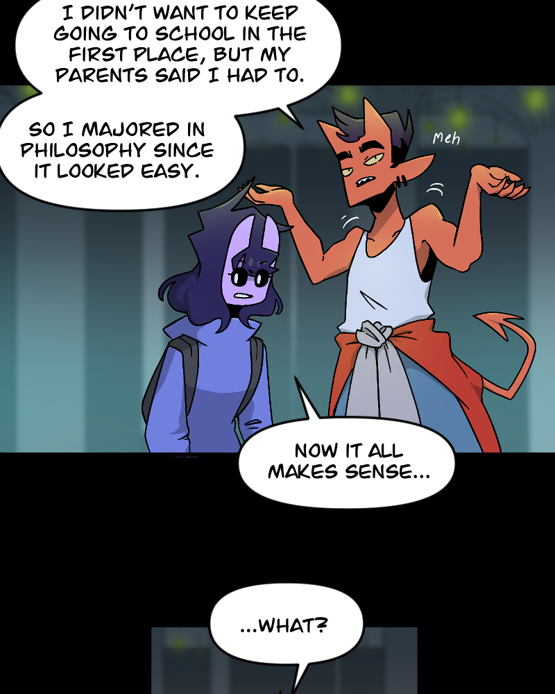 Set in a university full of demons, the perfect, straight-laced student Lucy accidentally casts a curse on another student named Chris. But the thing is, she can't undo the curse, and it turns him into a crusty old man when he does mean things! Now they have to work together to break the curse.