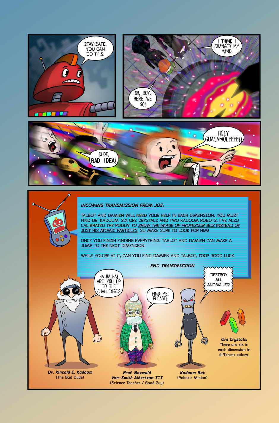 When evil scientist Dr. Kadoom returns from another dimension and zaps Professor Bozwald, the only person who can stop him, it's up to a couple of kids and their robotic friend to save the world. The Tall Tales of Talbot Toluca is not your typical book. It combines the high-impact visuals of graphic books while engaging the reader with hidden-object games, mazes and puzzles. Join Talbot and Damien in an out-of-this-world adventure that's sure to test your wits. Help them bring back Professor Bozwald and stop Dr. Kadoom from taking over the world. This book contains puzzles, hidden-object (where's waldo style) games and more! Talbot Toluca #1 - Quest For The Ore Crystals is a Winner of the 2015 Moon Beam Children's Book Awards and 2015 National Indie Excellence Awards.