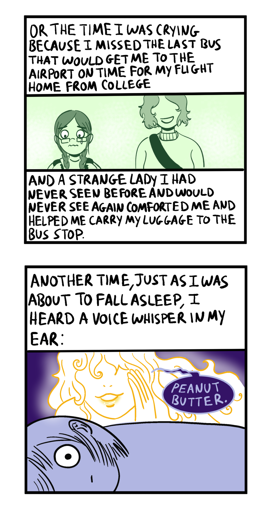 1) If that was my guardian angel speaking to me, I guess they're not wrong? 2) The reason a stranger helping me was so unusual is because my town/college was so small that I had seen most people there at least a few times 3) An otherworldly voice told me to "create something beautiful" and I'm out here making...whatever this is haha