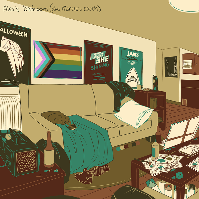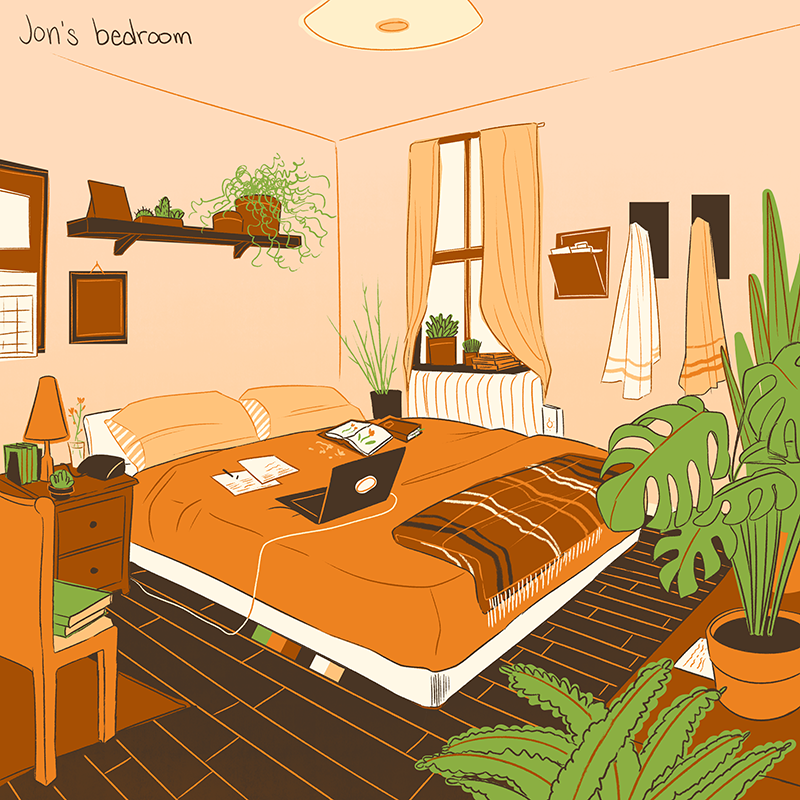Here's one more post to set the scene of these characters! Jon and Alex lived in two very different environments before they met. Due to money troubles (mainly, not having any of it), Alex lived on the couch of his childhood friend Marcie -- while Jon's only roommates were potted plants. The final design of their rooms have evolved a bit more over time, and you can see what they look like now in my main webcomic, "It's Kind of a Funny Story!" https://tapas.io/series/Its-Kind-of-a-Funny-Story