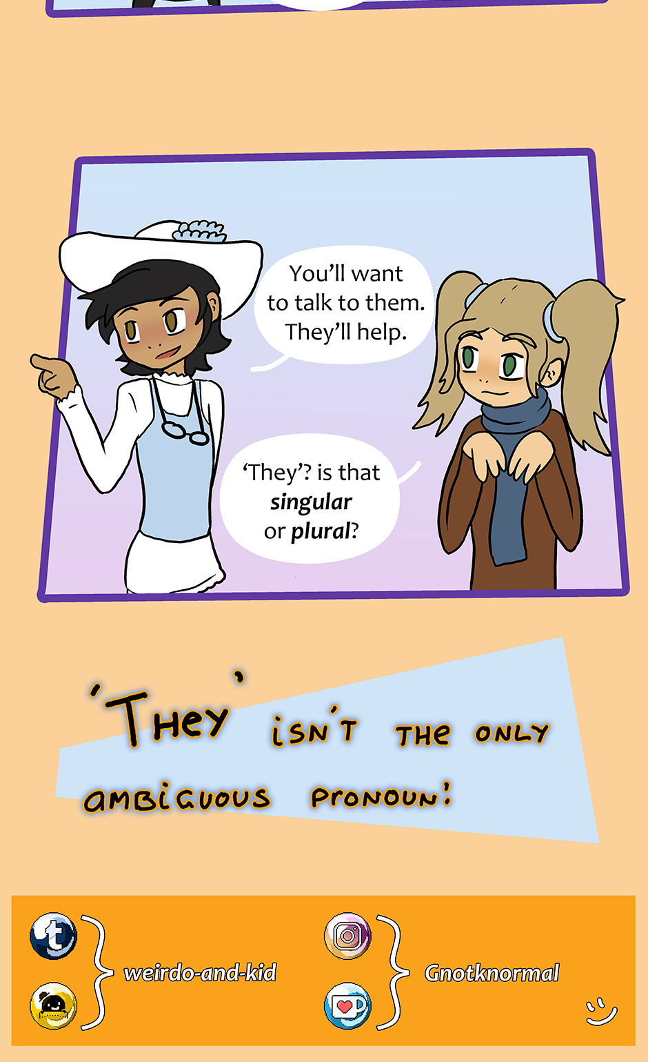 It always annoys me when people say they don't want to use 'they' pronouns as a singular pronoun. "It's too confusing, we won't know if someone is talking about one person or multiple people!" It's ridiculous. We usually work it out from context, and if not, it's okay to ask. What's more, it's not even the most commonly used ambiguous pronoun in the English language.