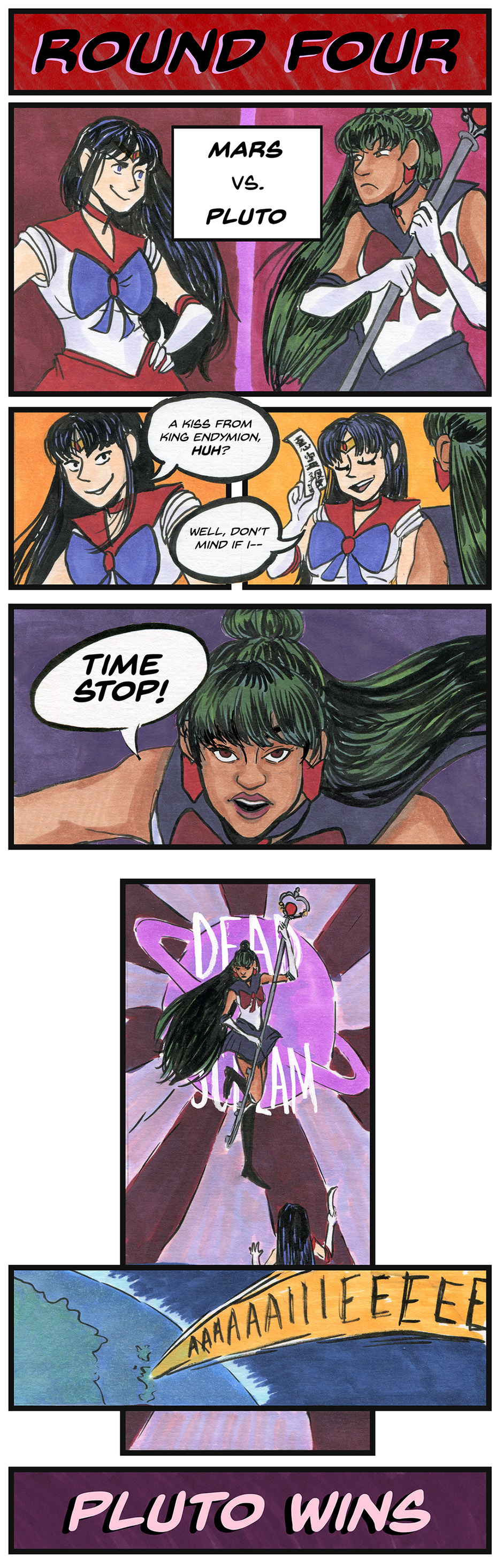 This Sailor Moon fan comic was our first attempt at a multiple page comic, completed in 2014. The art is done with Copic markers and it's not to be taken seriously in the slightest.