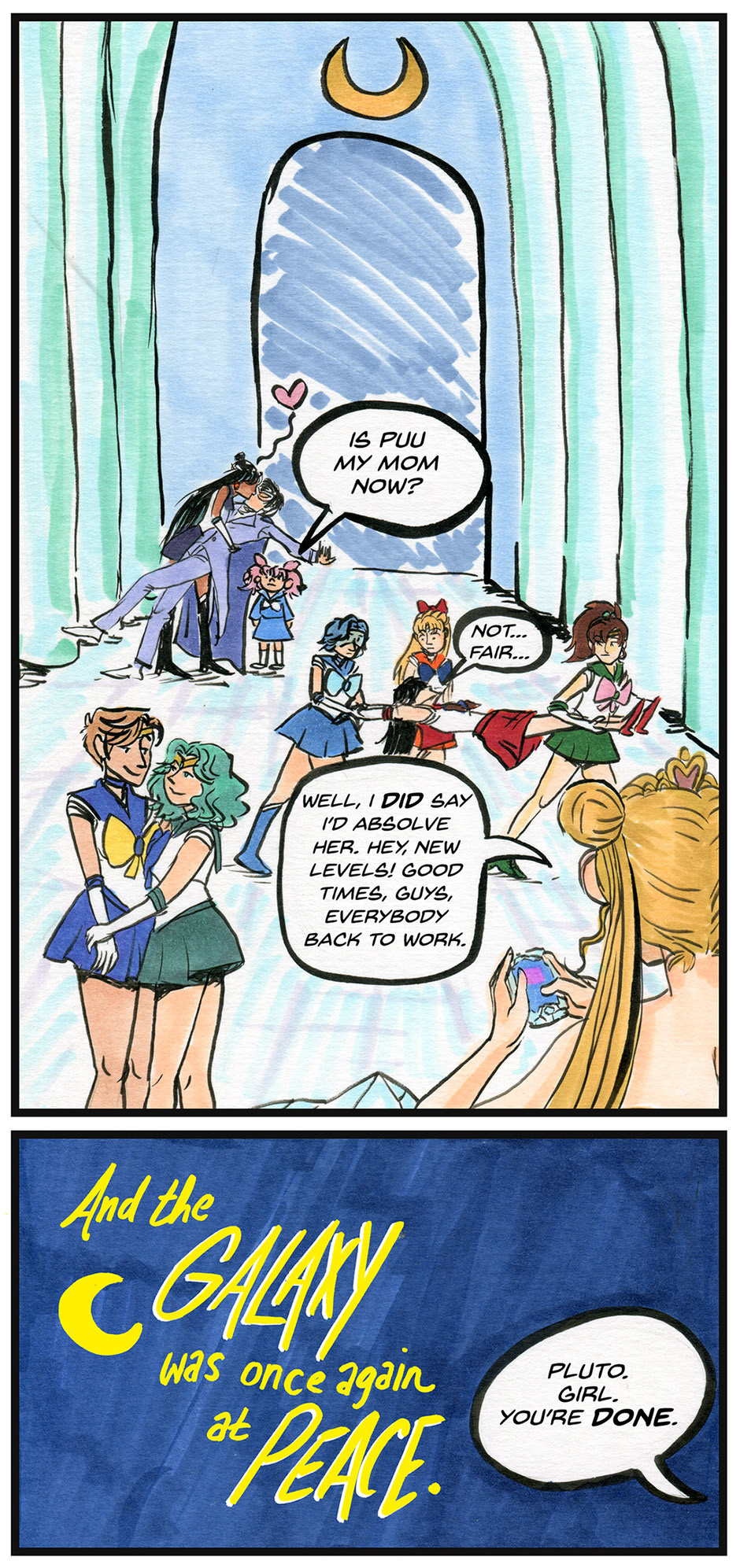 This Sailor Moon fan comic was our first attempt at a multiple page comic, completed in 2014. The art is done with Copic markers and it's not to be taken seriously in the slightest.