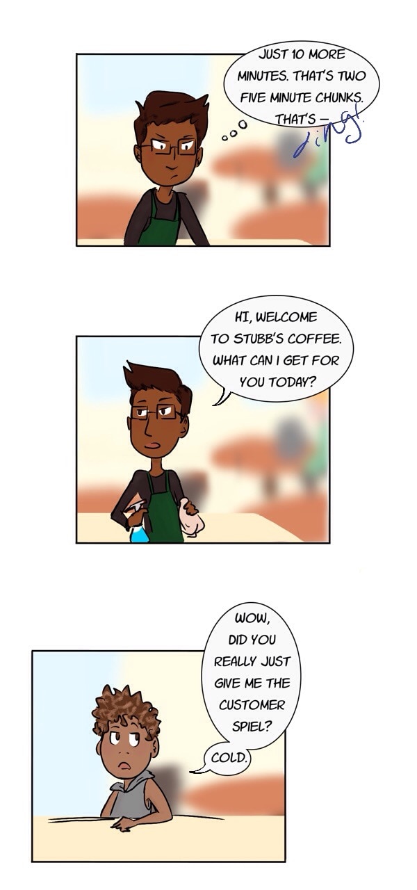 ok so if i make $10 an hour. that's $5 per half hour. which is $1 every six minutes. which is 50 cents in 3 minutes. if 1 coffee is $5. thats 30 minutes of work. which is five six minute chunks. which is