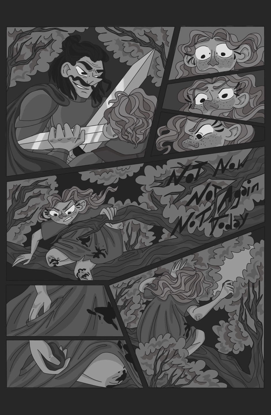 Until the wave got too big and when it came down she has seen a spark, a sword to a sword. Her feather was under both of them. She stared wide eyed, her head stared pounding, she felt cold and hot. A girl saw red around her. Red like that cape, red like those drops which were spattered on knees and dress. Her head pounded harder, throbbing in the rhythm. Not now. Not again. Not today…….