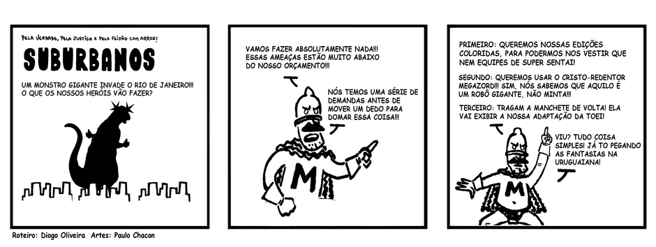 O escritor Diogo Oliveira e o desenhista Paulo Chacon trazem até você a super equipe de 'Suburbanos' enfrentando um ataque monumental a cidade que pode transformar o estilo da equipe para sempre! Ou até a próxima tirinha pelo menos...
