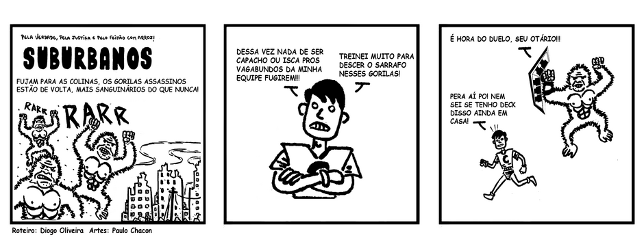 As tirinhas de Suburbanos estão de volta e rápido dessa vez, escritas por Diogo Oliveira e desenhados por Paulo Chacon! Se você não leu o segundo volume de Suburbanos 1) vá em nossa loja AGORA e compre o seu exemplar 2) saiba que Camelô Prodígio e os Gorilas Assassinos tem uma nada amistosa história, e é hora de finalmente o sidekick ter sua vingança, mas será que ele estará pronto ao desafio?