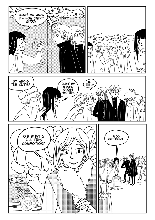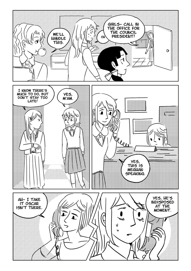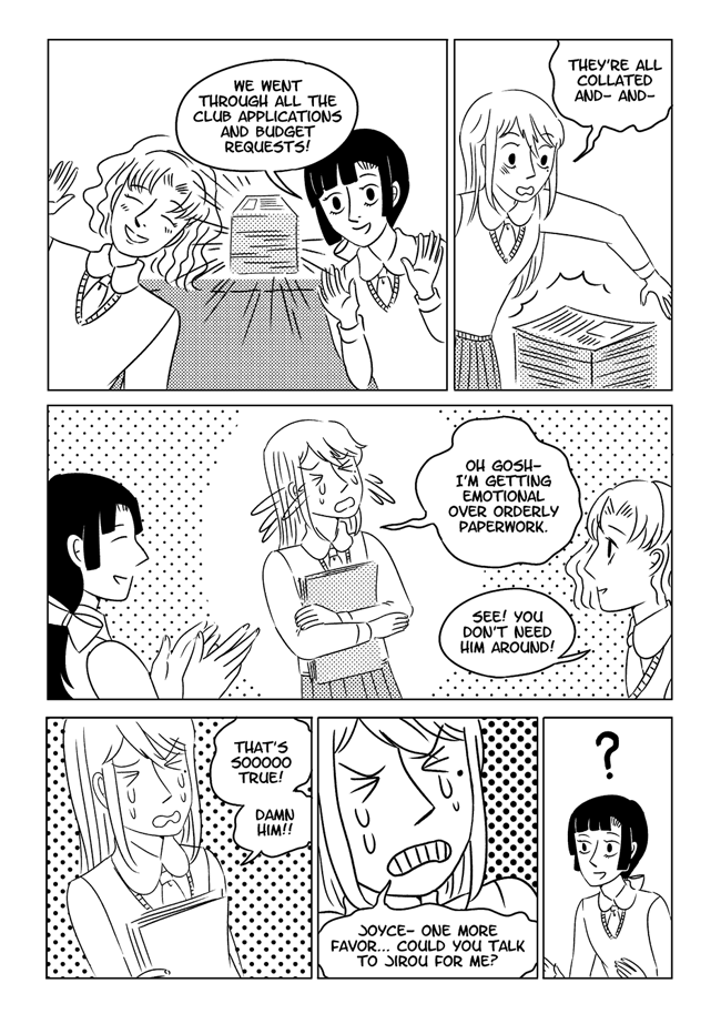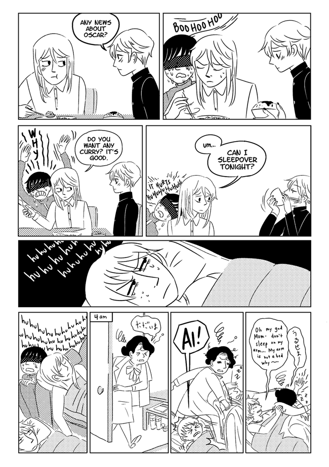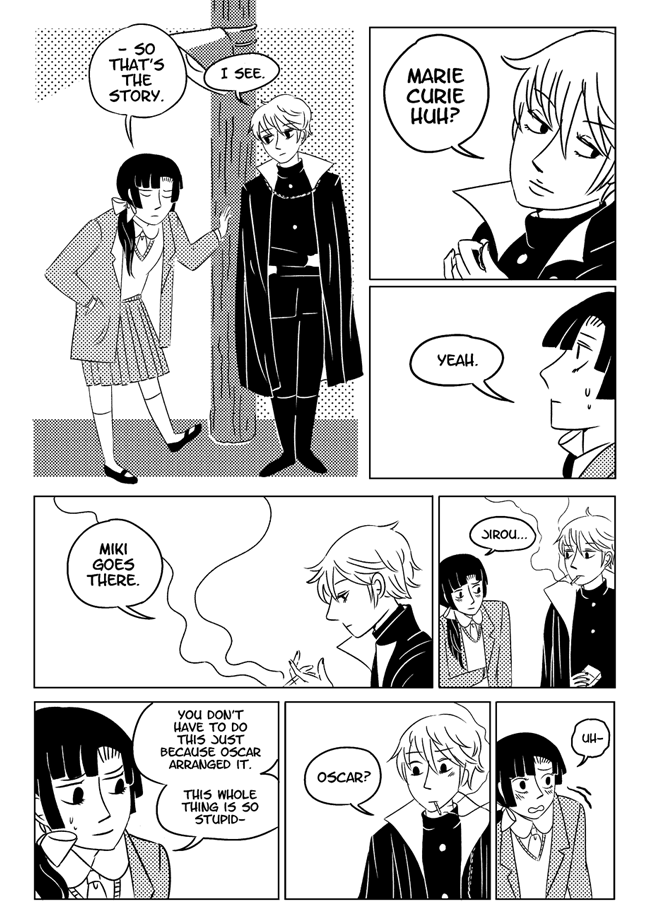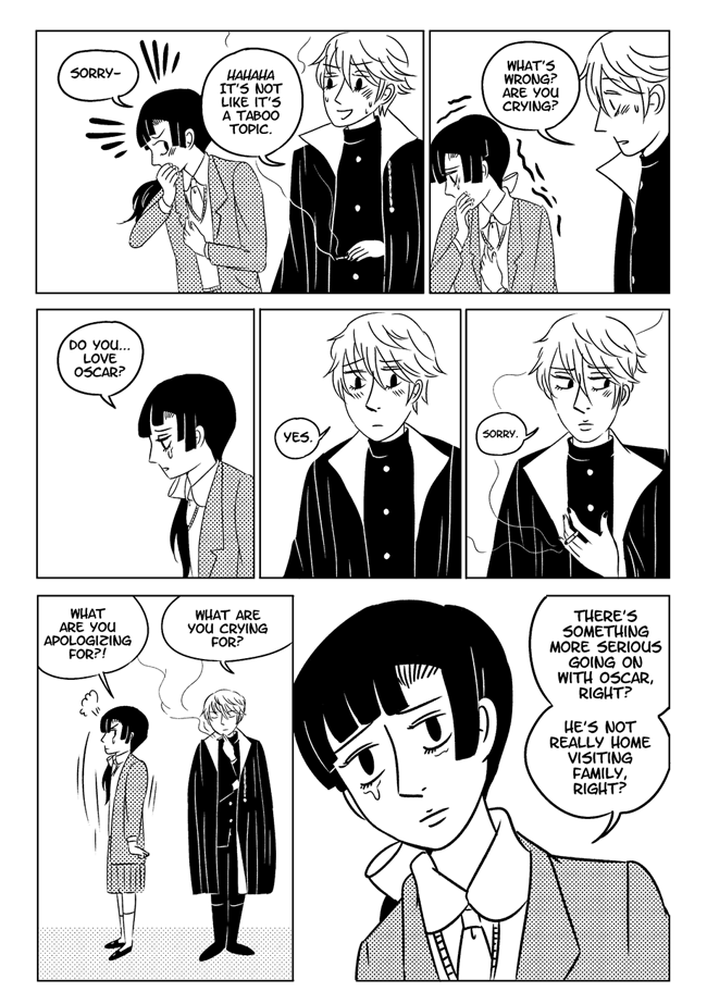 High school delinquent Jirou has a lot of indescribable feelings for student council president Oscar who actually has a huge secret that makes it difficult for him to get close to anyone. In order to survive he and his friend Vivien take on ghosts and demons in the middle of the night. About trauma, friendship, soft feelings. Romantic, comedic, and nostalgic and full of love for all the characters.