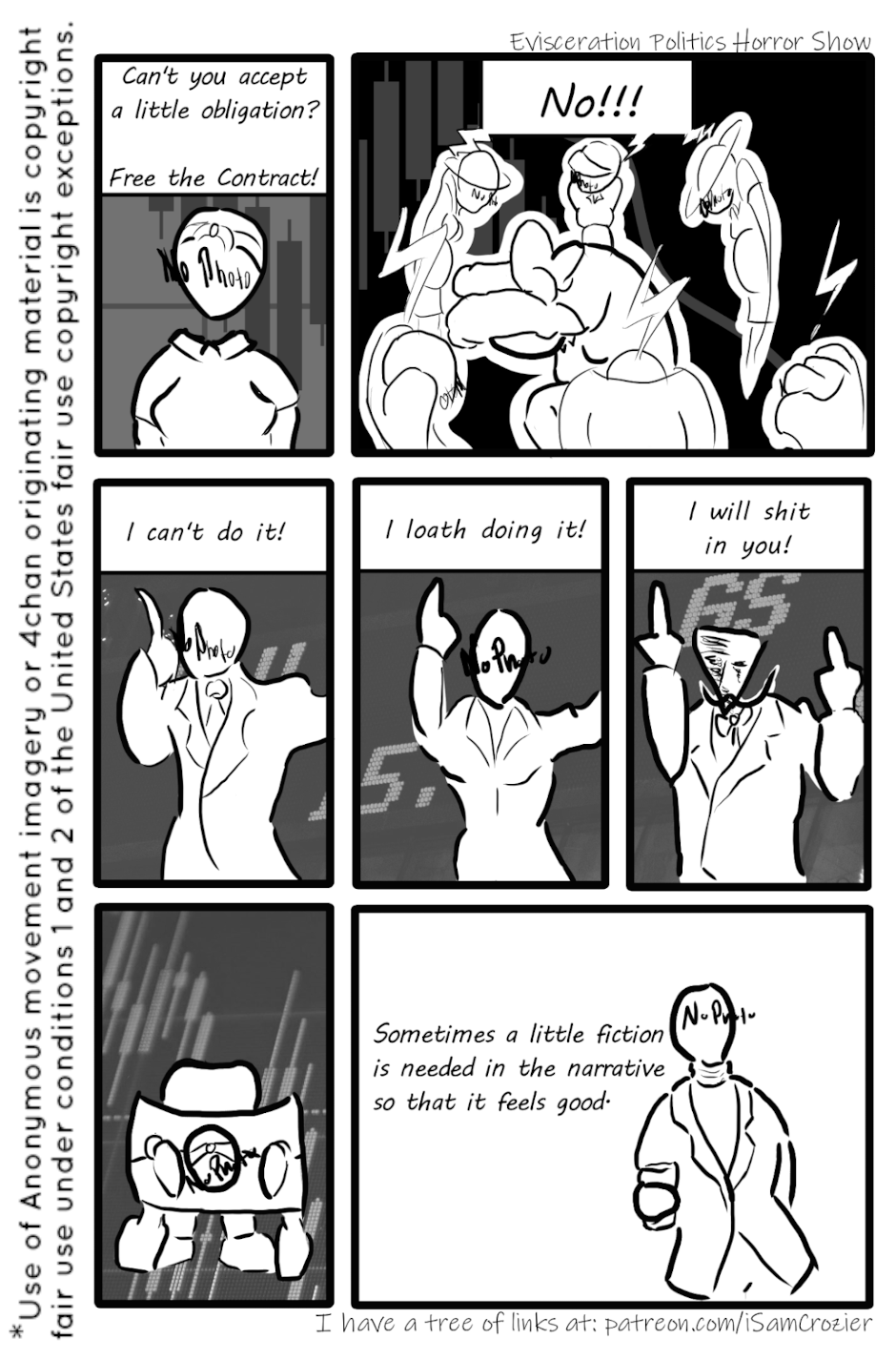 Evisceration Politics Horror Show is a daily comic; only borrowing the page structure format. Almost every page is separated in theme from every other one. Only daily in sequence, the comic is released on Mondays, Wednesdays, and Fridays.