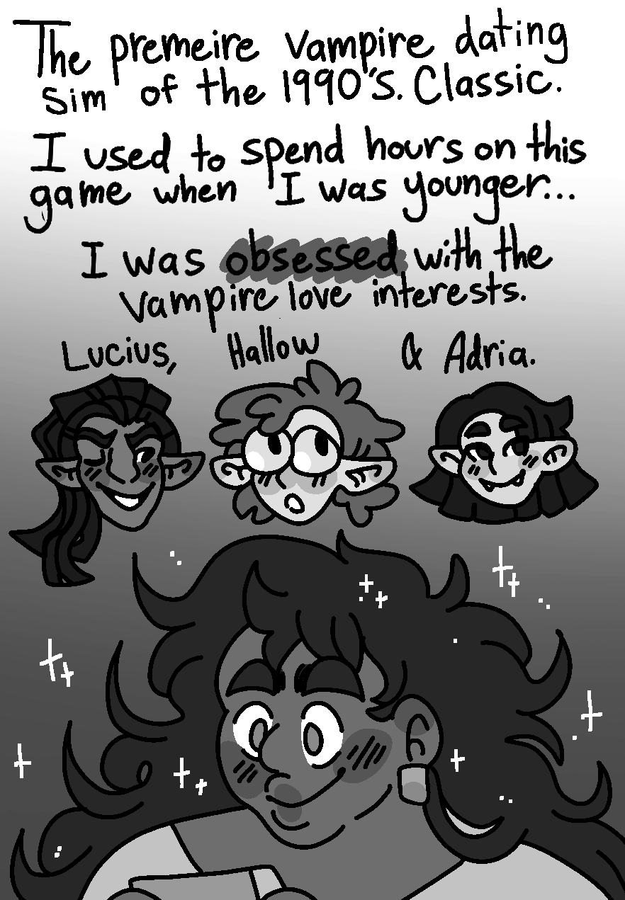 A dark and stormy night is the perfect time for a dashing vampire to make an appearance. Unfortunately, vampires only exist within the fictional realms of stories, legend, and in this case, a video game. Luckily for Morgan, an avid vampire romantic, this storm with give them the opportunity to get closer with their favorite undead virtual love interest, Adria!