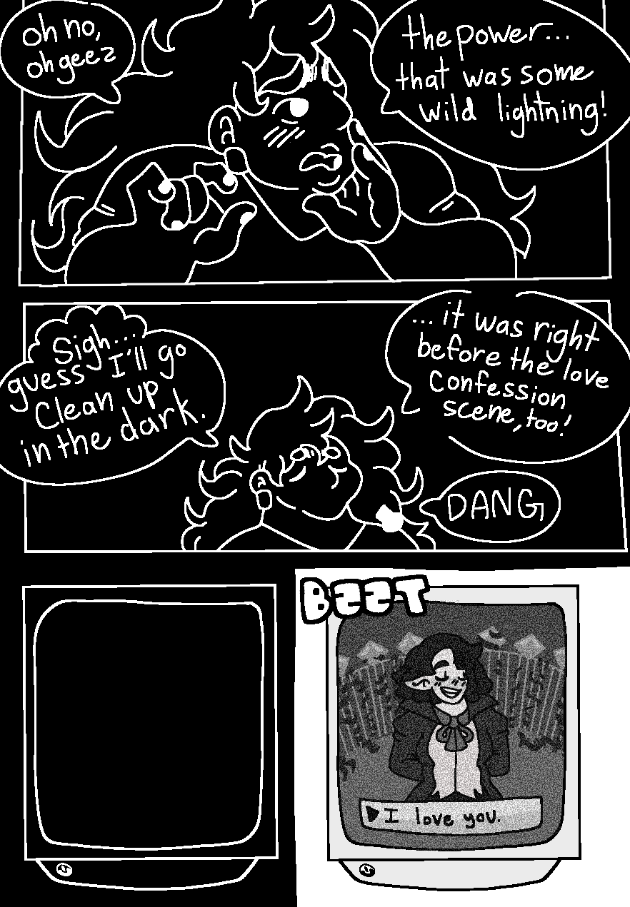 This FULL comic is 50 pages of black and white NSFW queer vampire on human romance. The SFW pages are available to read here, but if you want to finish the story (and are 18+) you can buy it from my itchio!