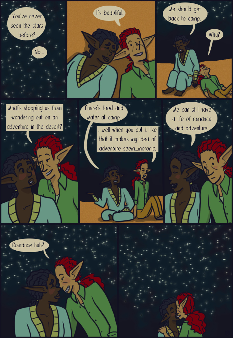 Desert Grey is a tale of gay elves who over come oppression with explosions in a fantasy world during it's equivalent of the 1960s. More specifically it's about two stories happening simultaneously about a lesbian cop who searches for answers after tragedy befalls her and a gay biracial alcoholic who reconnects with his father's people.