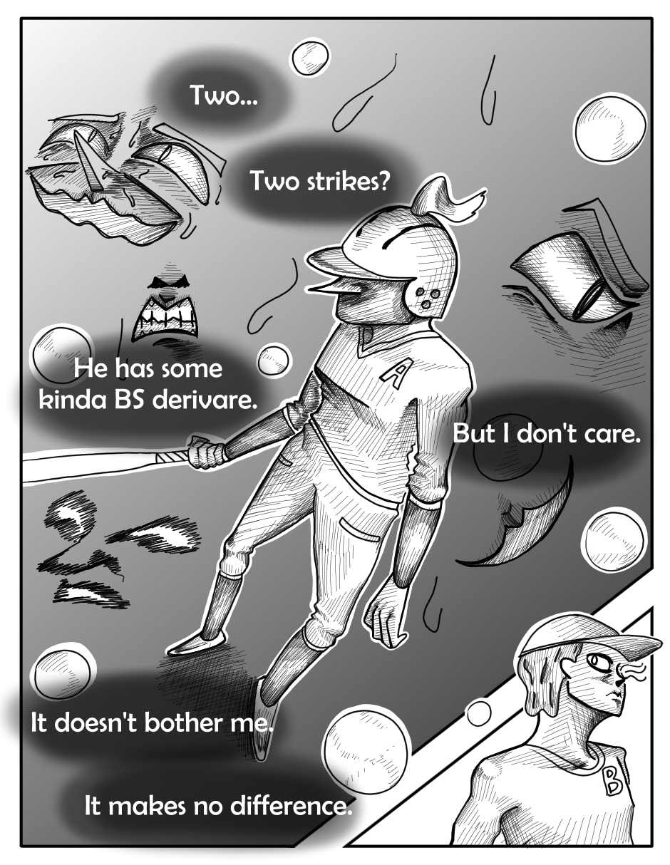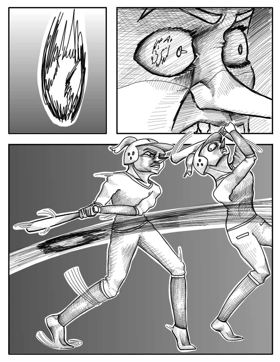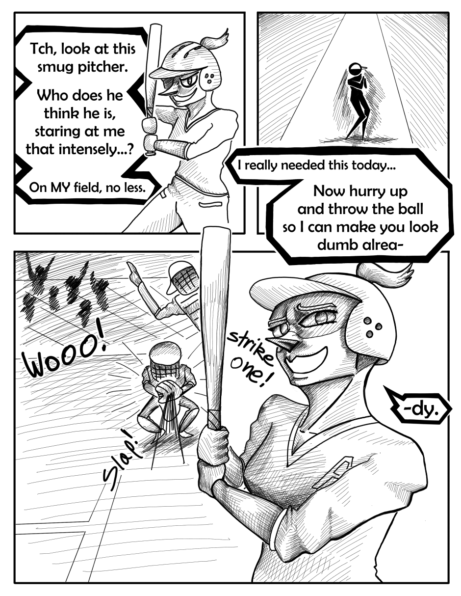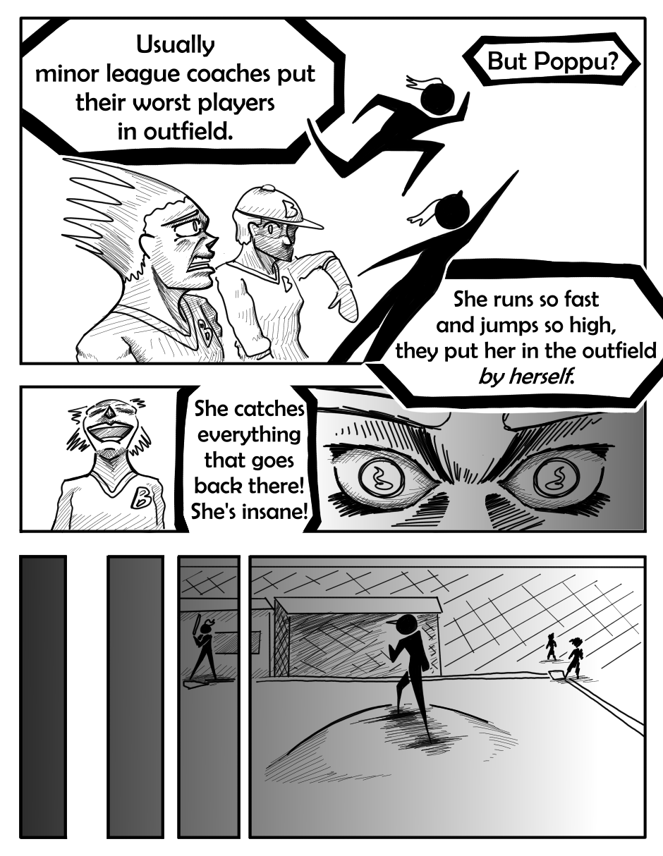The original draft for this episode was more comedic, but I felt like that didn't really match the kind of tone this one should have. Like there was one page where Poppu wonders how the catcher is ok after catching a pitch like that twice, and when she turns to look at him he's shaking a lot. I thought it was pretty funny when I came up with it, but I realized it didn't really fit when I started drawing.