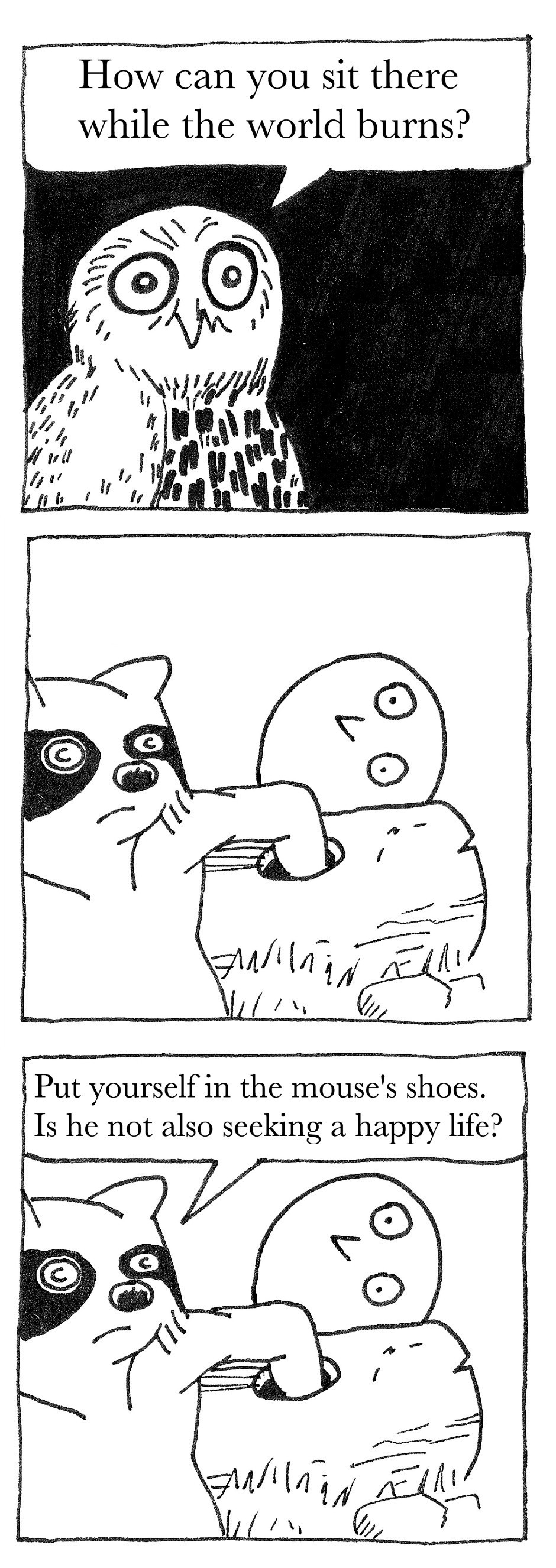 Raccoon turns it around on owl, again.