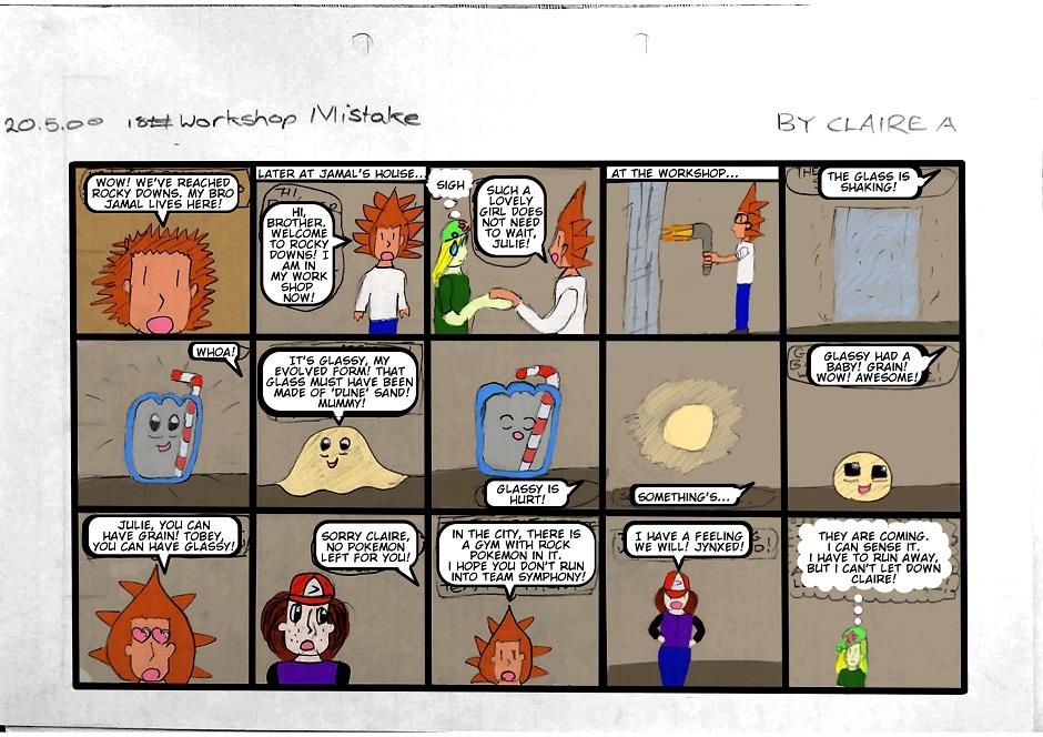 As part of the blog pokemontimecapsule.wordpress.com I am digitally colorizing and archiving the comic I wrote when I was ten years old. Claire Ketchum embarks on her Pokémon journey in the year 4000, a tradition which spans over two millenia following the likes of her ancestor Ash and his journey. In classic ten-year-old-kid writing style, you can expect a great deal of plagiarism from the Pokémon anime, nonsensical plot and character details, and a whole ton of imagination. There are over 100 pages of this comic and I intend to upload one episode per week until it's all done. I apologise for how bad it is! But you might find it interestingly-bad or funny-bad depending on your tastes.