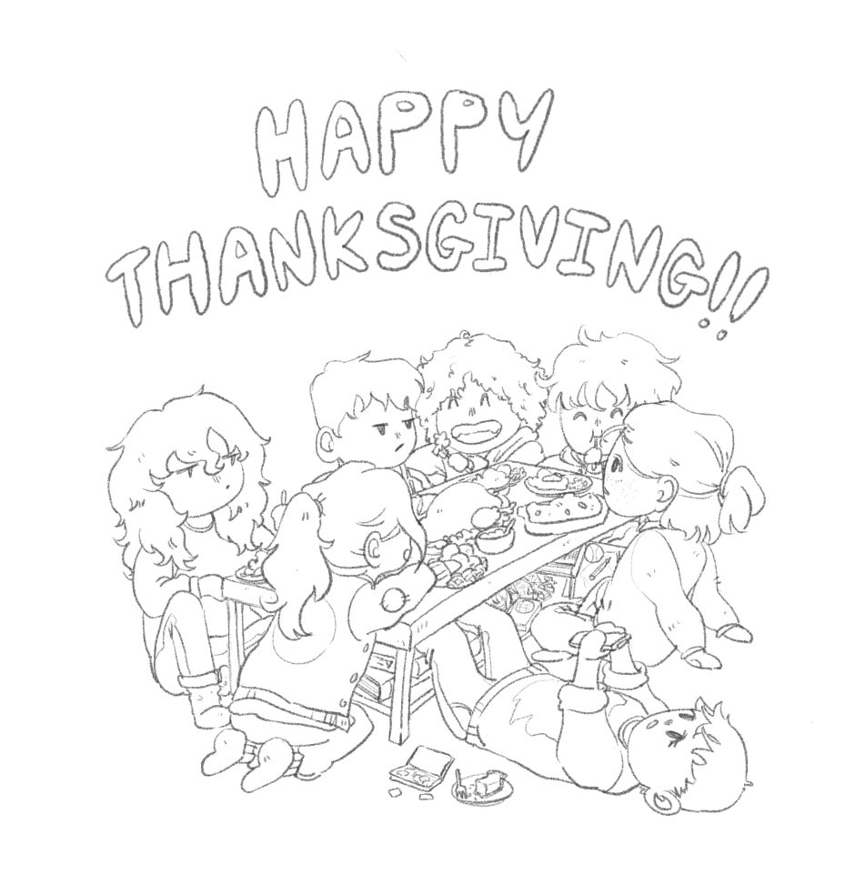 Characters around the table from very far left clockwise: Aleksei, Bishop, Lawson, Thomas, Robin, Jenni, and Erin. I know you've only met Robin so far but I wanted the whole gang together. Also like the clown that I am I got halfway finished with coloring this before realizing that the sketch looked better :<