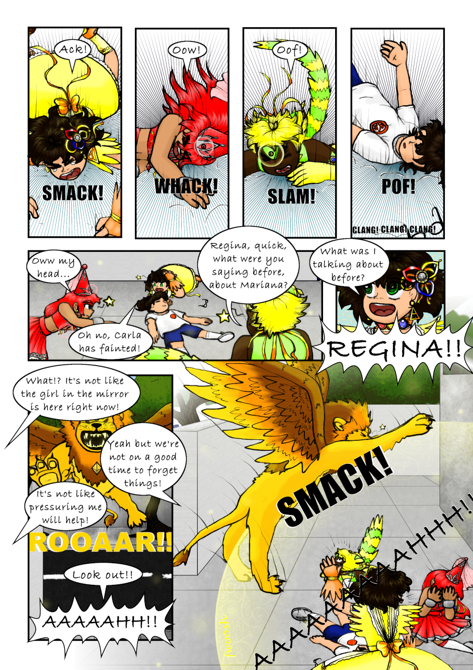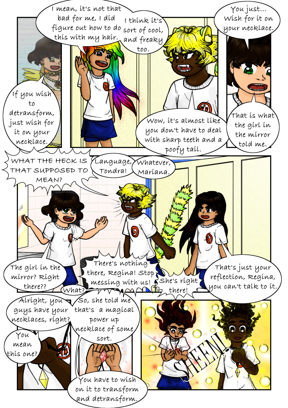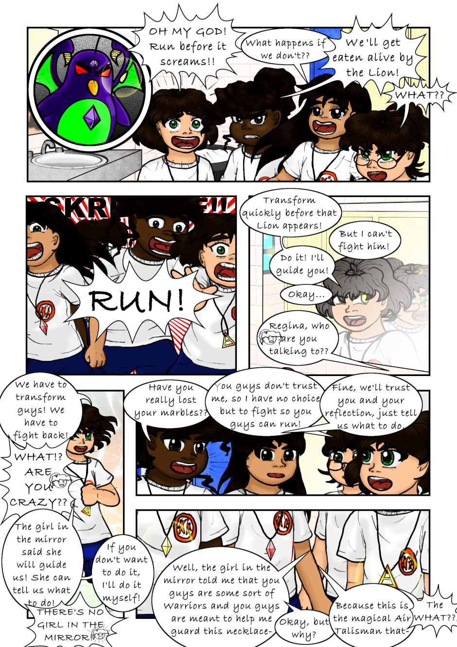 The Clairvoyant told Regina she has to seek the Air Necklace to guard it, and told her to find the Warriors. Regina accidentally found a magical necklace that made her and a couple of her classmates turn into magical girls. Also, a talking flying lion is after them. Not to mention Regina's reflection speaks to her now. What a mess, can anyone Regina, Mariana or Tondra what is going on?