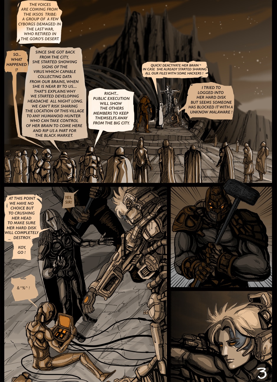 A cyborg with a baby on his shoulders escaped from a lab and found a tribe of others cyborgs in a middle of a desert who hid themselves from the cities's bounty hunters...