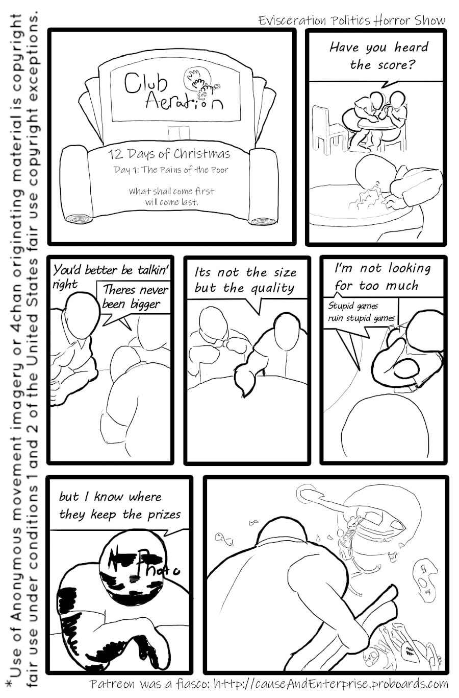 Evisceration Politics Horror Show is a daily comic; only borrowing the page structure format. Almost every page is separated in theme from every other one. Only daily in sequence, the comic is released on Mondays, Wednesdays, and Fridays.