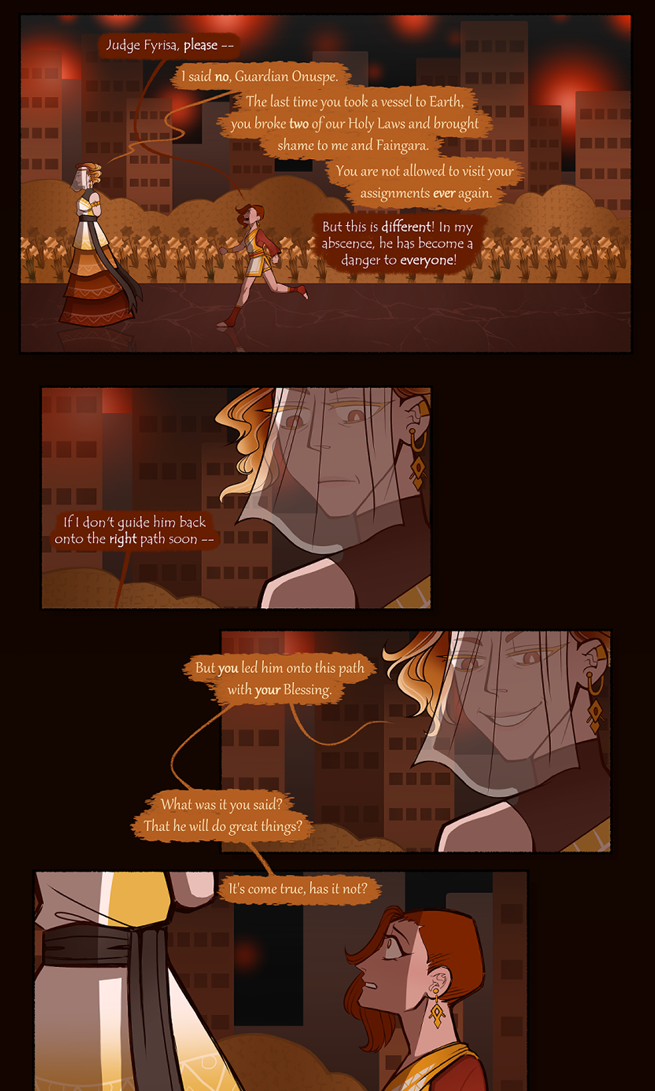 In Faingara, the Heaven of Fire Angels, a Guardian Angel named Onuspe finds himself in a dilemma when High Judge Fyrisa refuses to let him visit his assignment on Earth.