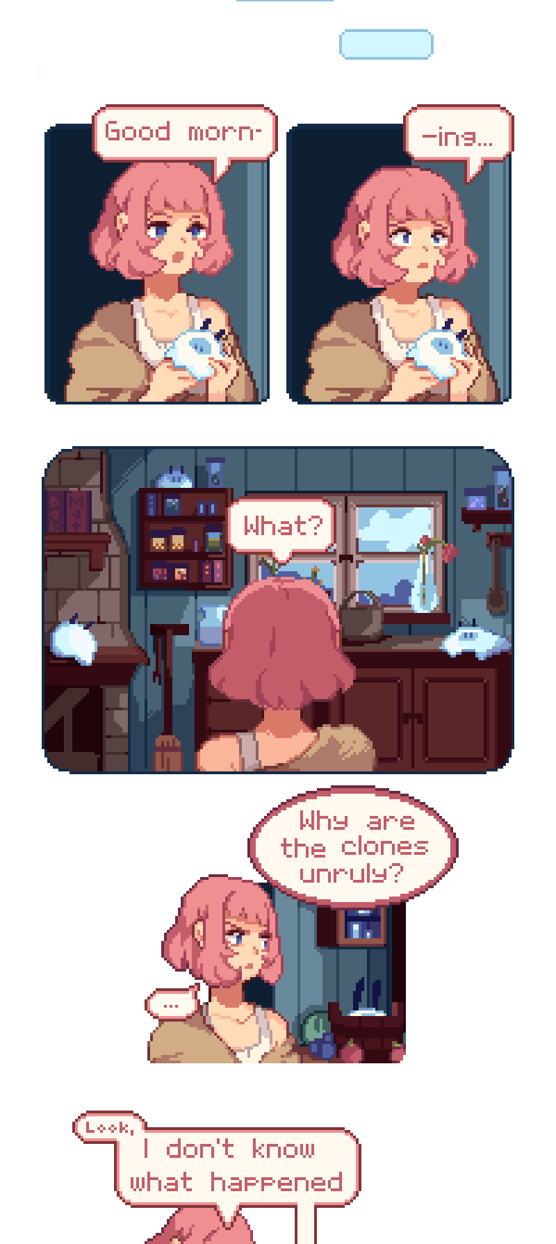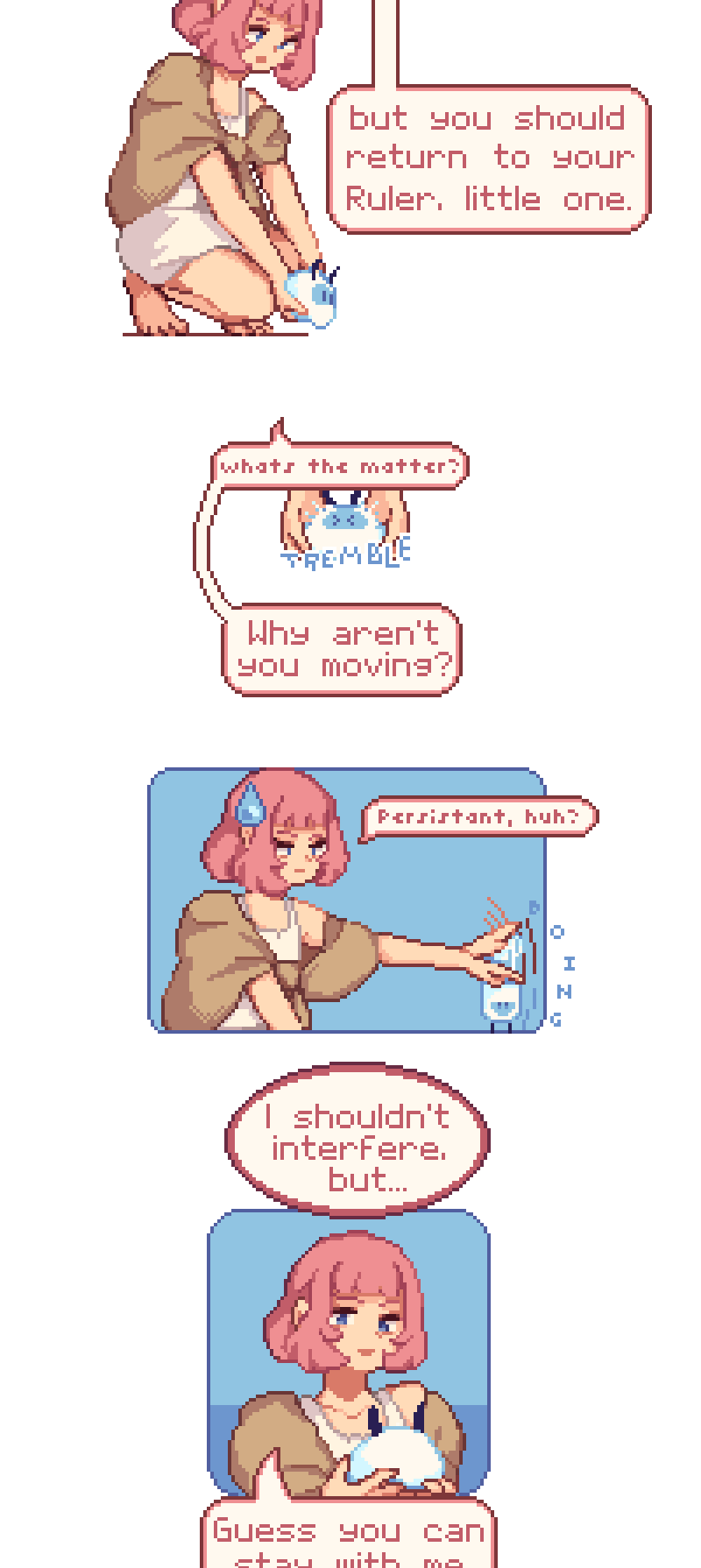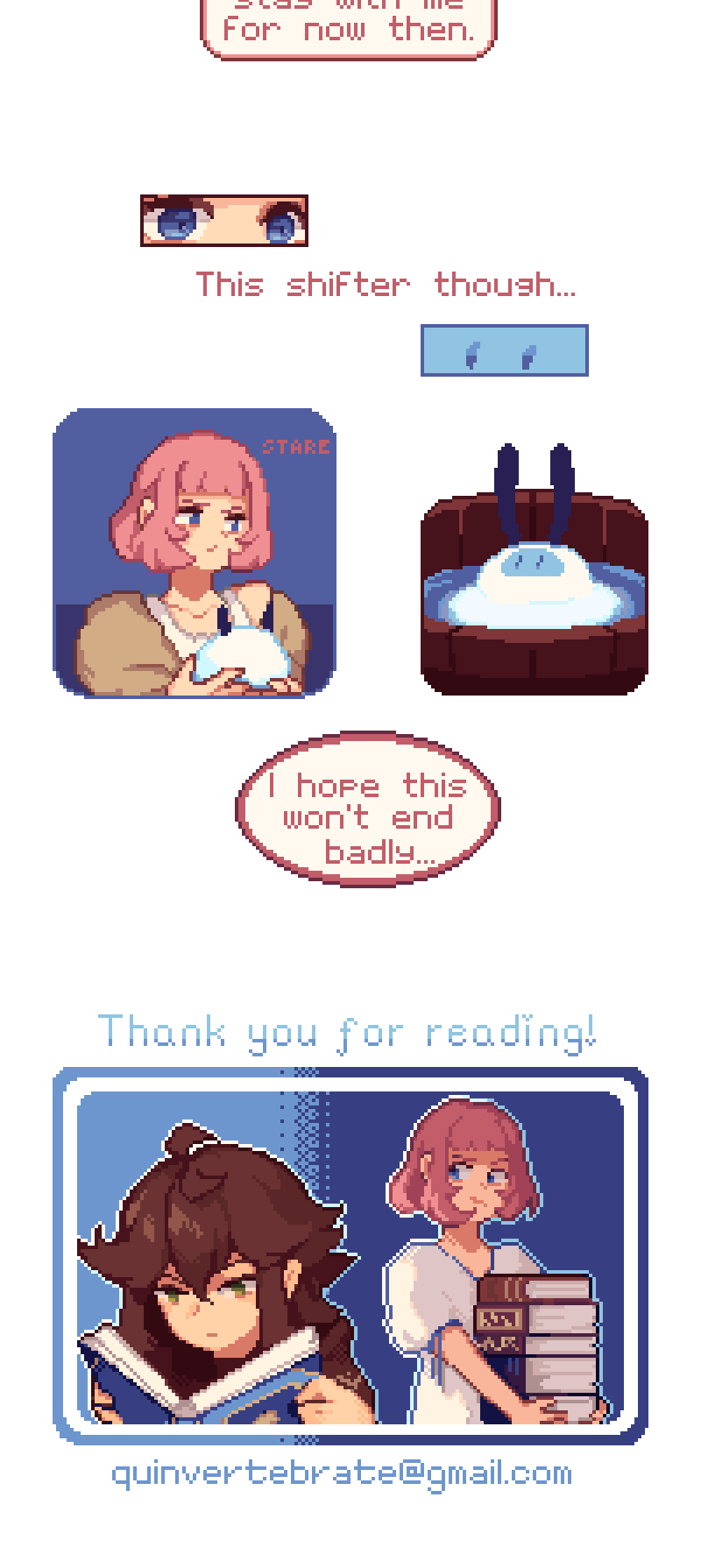 A devout, seemingly ordinary, and a shifter, expected to fill a role, find out they have a lot more in common than they first thought. With their newfound friendship, they will do anything it takes to leave the island they are confined to, even if it takes the summoning of a God to do so. [Pixel-art] [Slowburn] [SHORT updates]