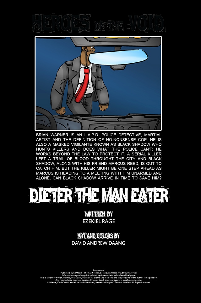 Brian Warner is an L.A.P.D. police detective, martial artist and the definition of no-nonsense cop. He is also a masked vigilante known as Black Shadow who hunts killers and does what the police can't: He works beyond the law to protect it. A serial killer left a trail of blood throught the city and Black Shadow, along with his friend Marcus Reed, is out to catch him. But the killer might be one step ahead as Marcus is heading to a meeting with him unarmed and alone. Can Black Shadow arrive in time to save him?