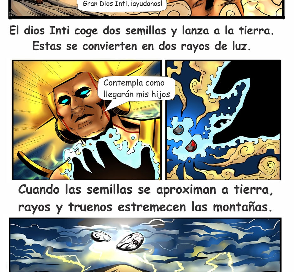 Los hijos del dios Inti, salieron de una burbuja de oro desde las entrañas de la Pachamama, emergiendo hacia la superficie de un gran lago, entre montañas y cristalinos ríos, para fundar el Gran Tahuantinsuyo, llegaron cuando más lo necesitaba el pueblo elegido del Dios Inti, ellos fundaron la Capital Cusco, enseñándoles técnicas agrícolas, de construcción, crianza de animales, metalurgia, entre otras cosas.