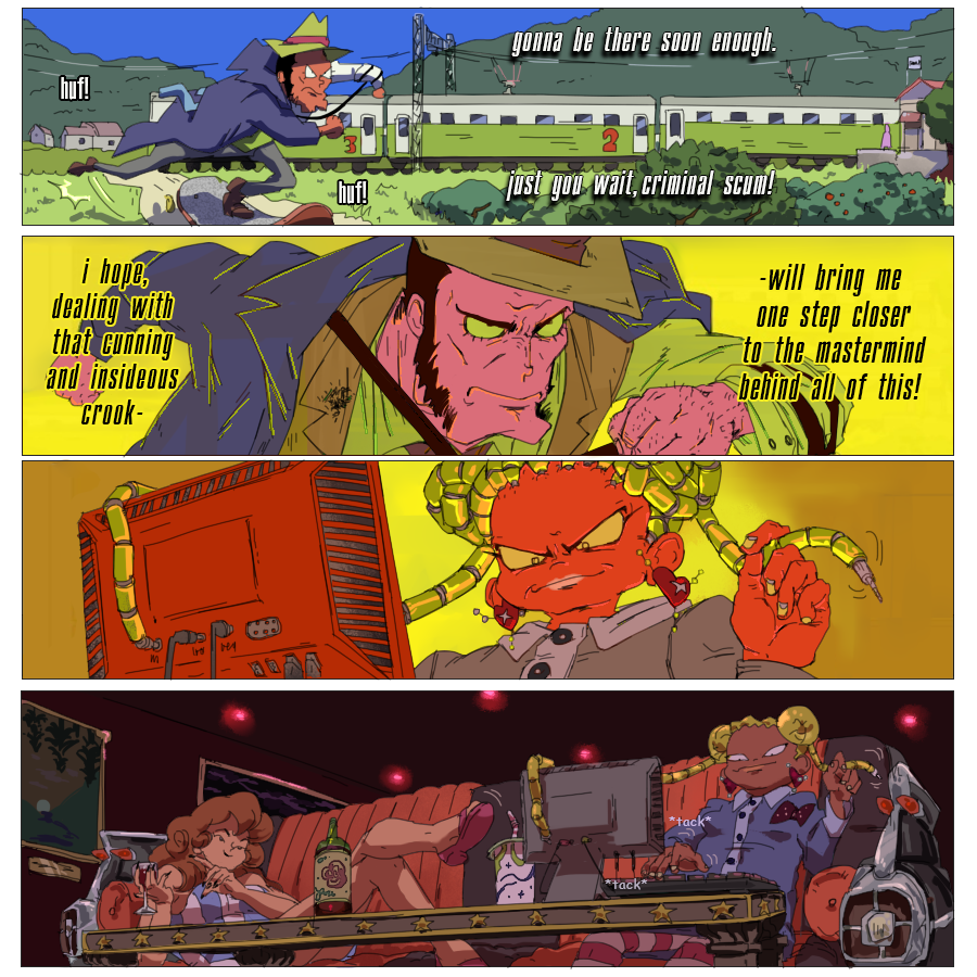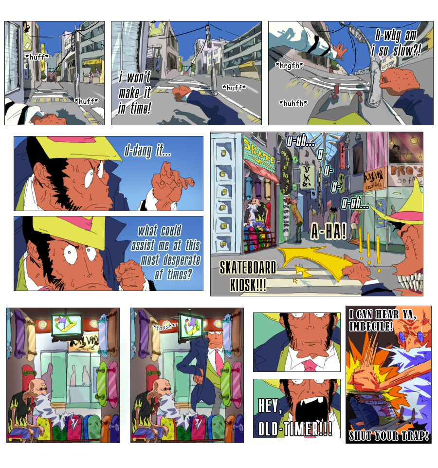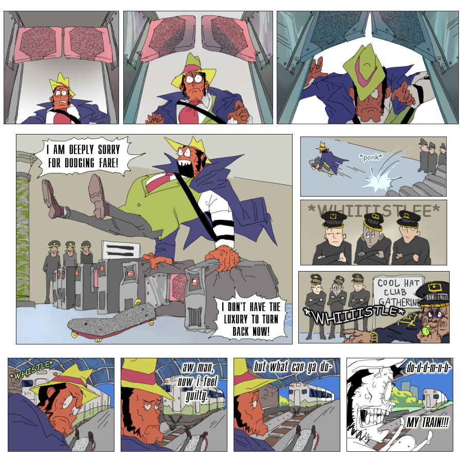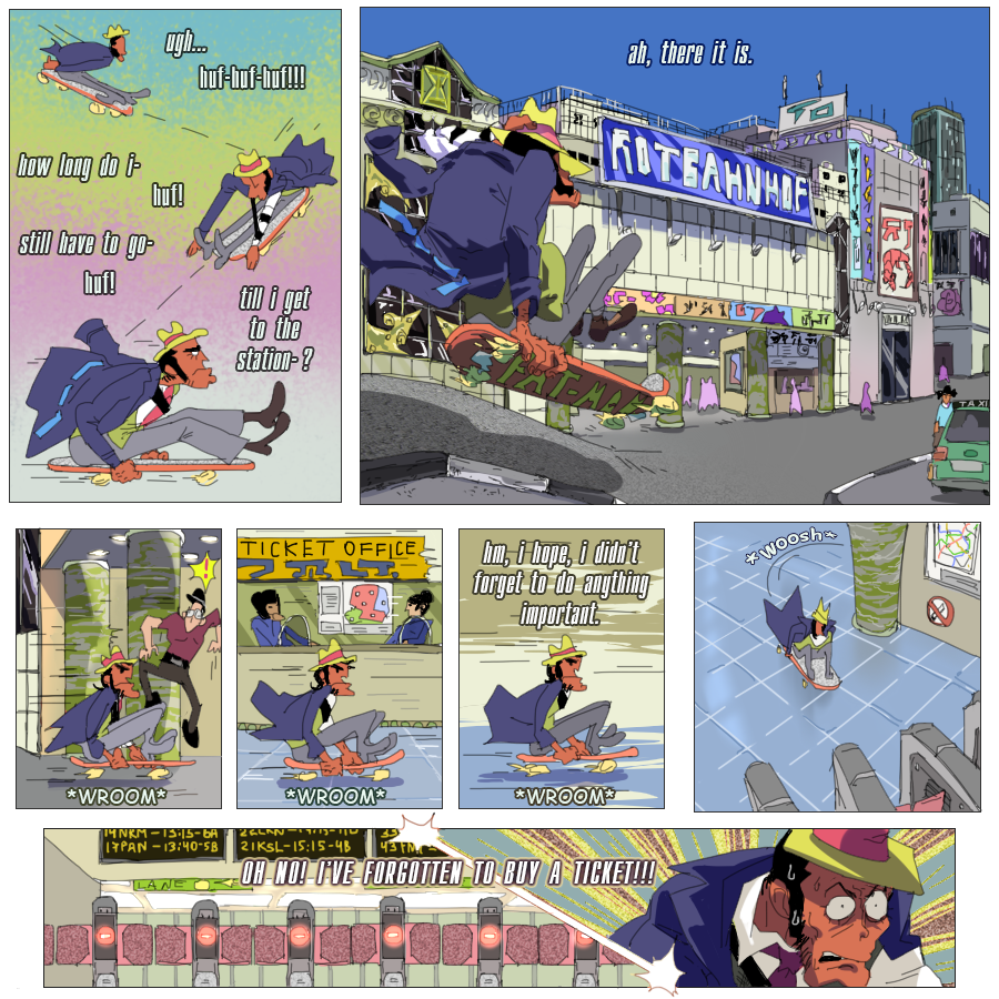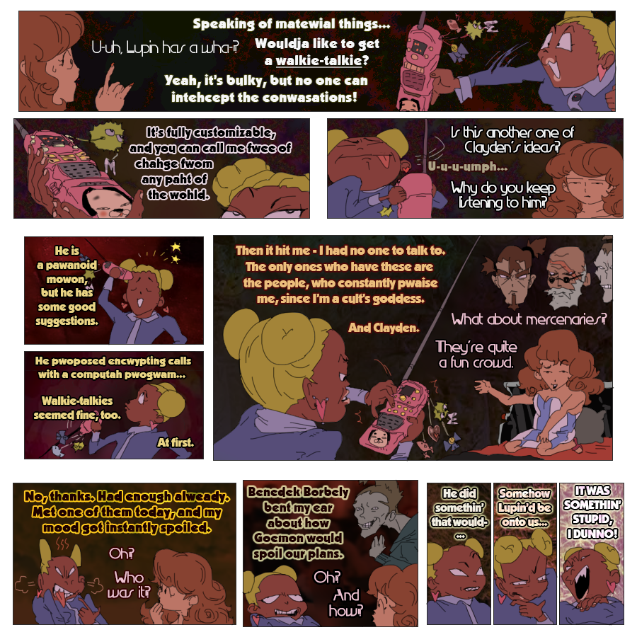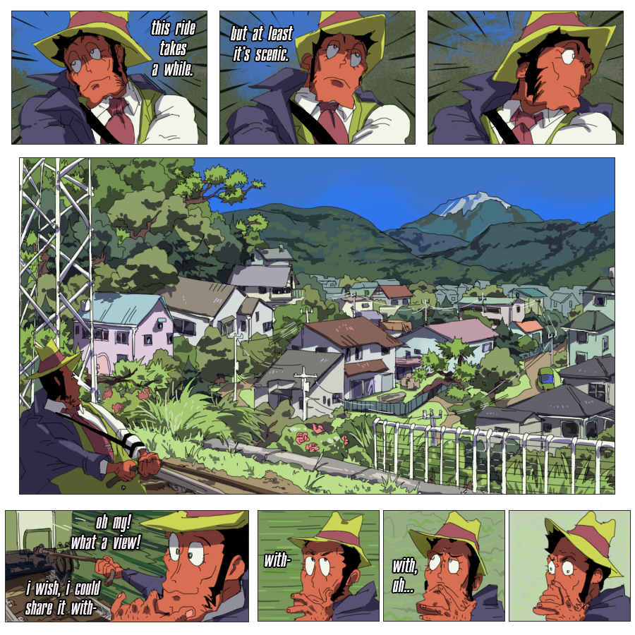 (Ekymen coloured some of the panels on the second page and sketched a few upper frames on the page where zeni goes to the train station; Ekymen also drew a sketch for a middle part of a page, where Mie pushes buttons on a walkie-talkie;