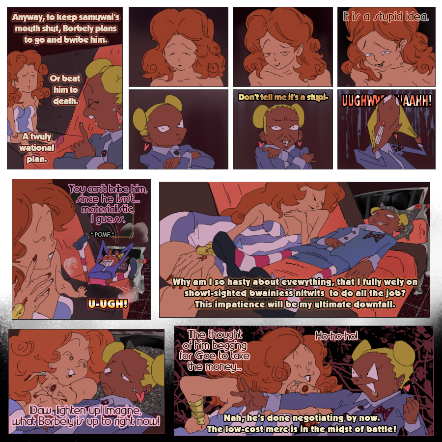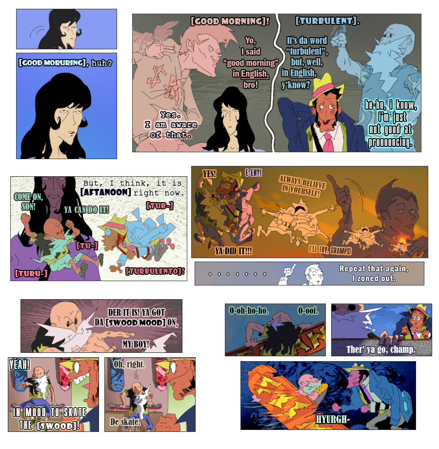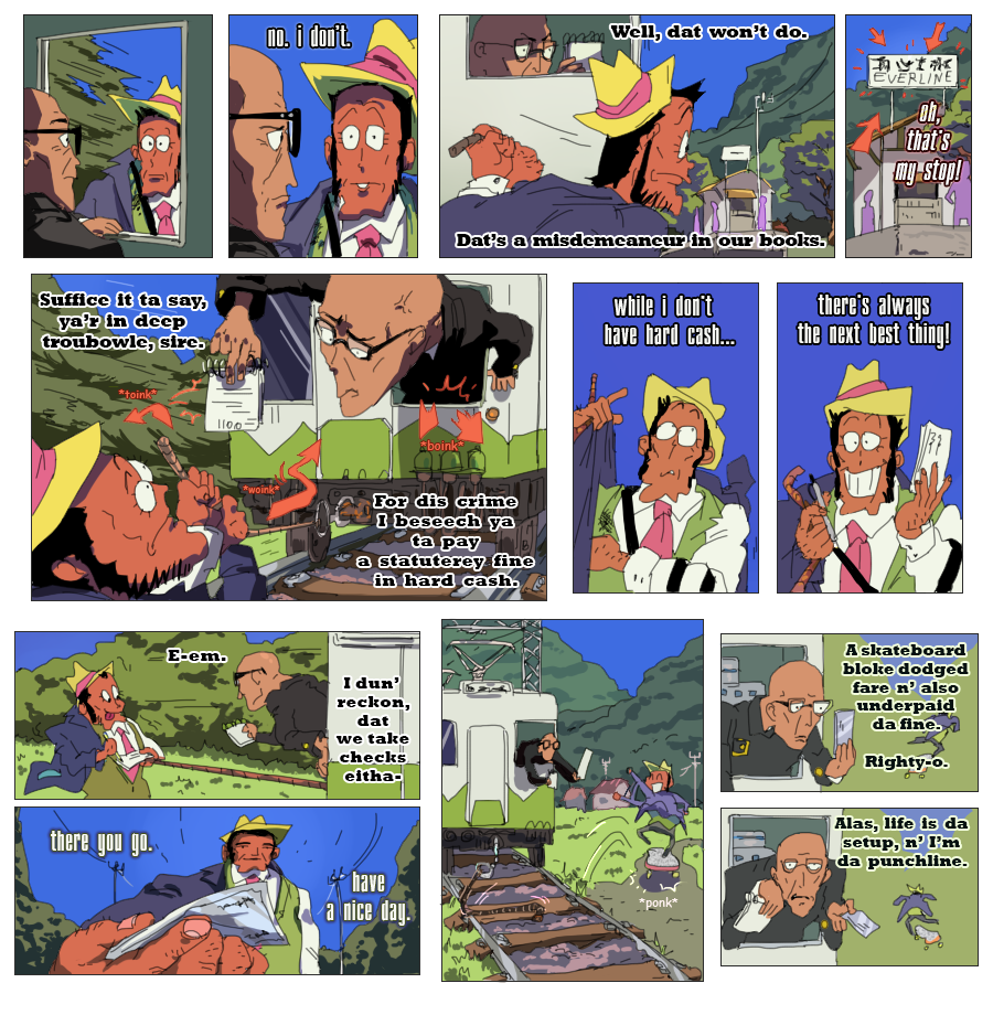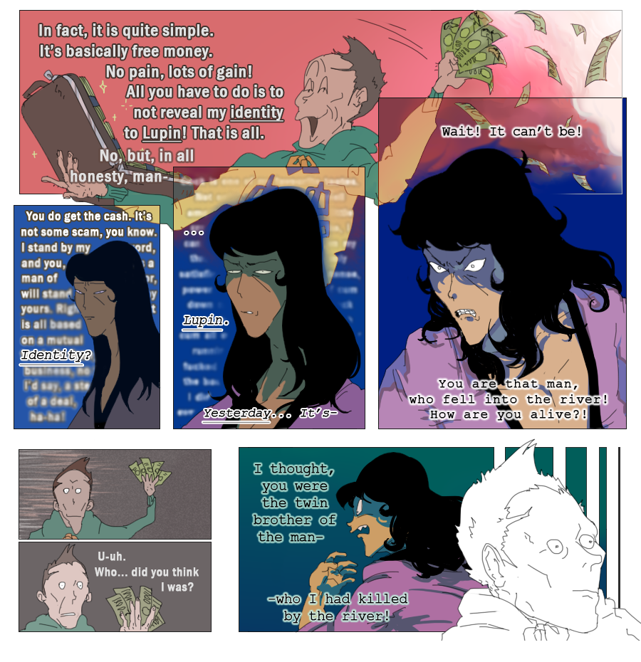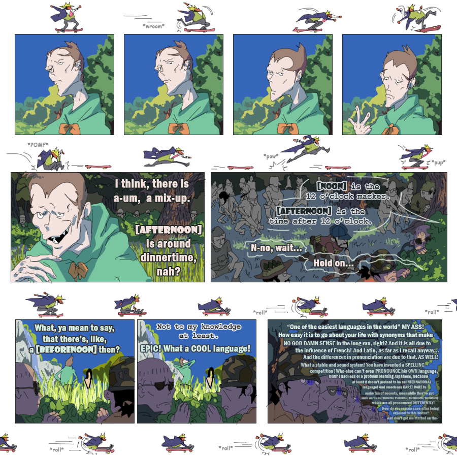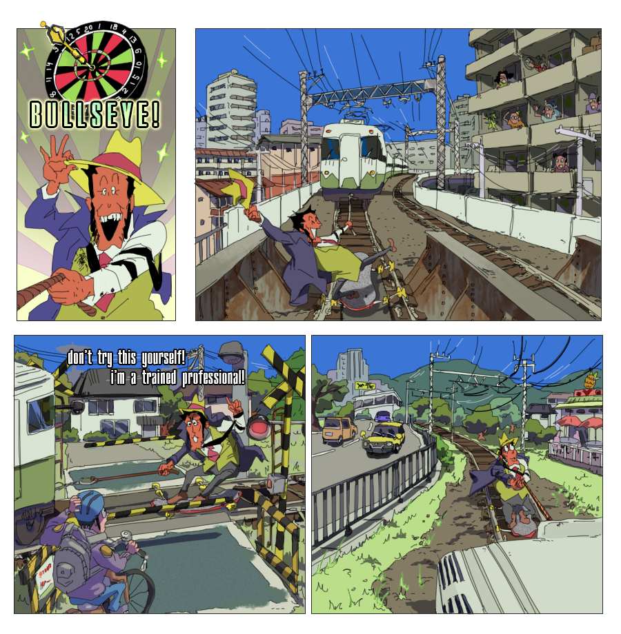 (Ekymen coloured some of the panels on the second page and sketched a few upper frames on the page where zeni goes to the train station; Ekymen also drew a sketch for a middle part of a page, where Mie pushes buttons on a walkie-talkie;