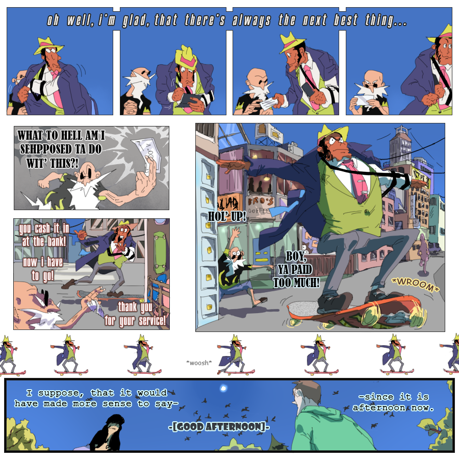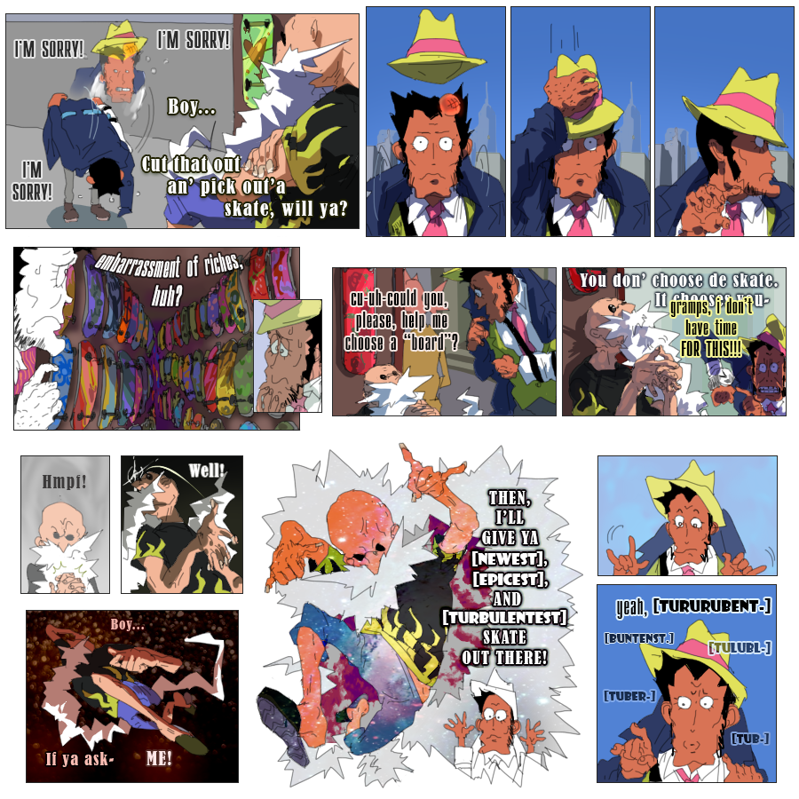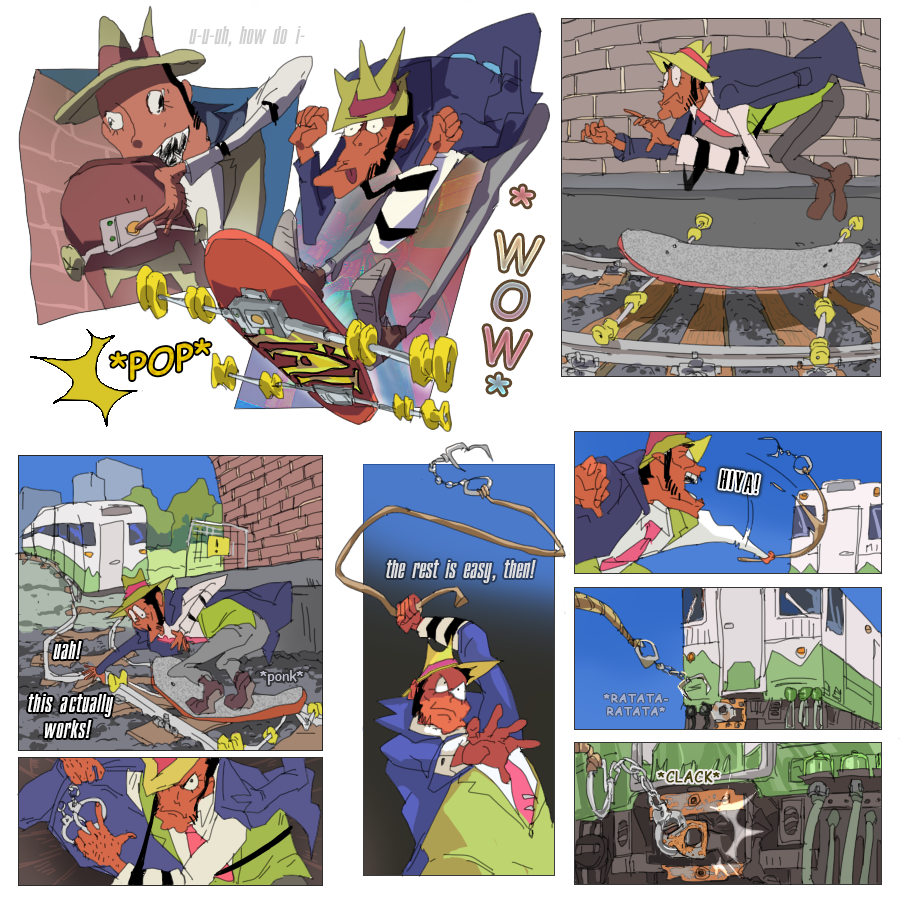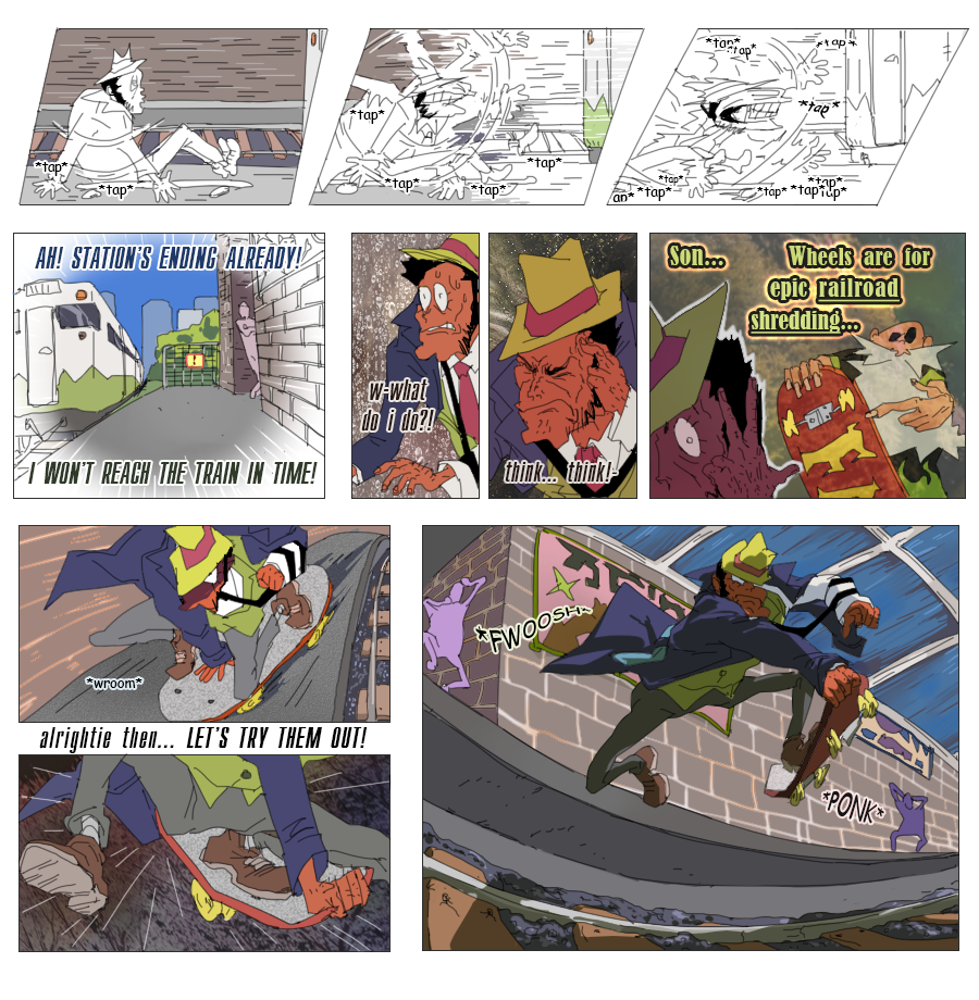 Lost cookie drew the first frame of the skateboard-on-rails page and then helped with the sketching of the page with a sunset)