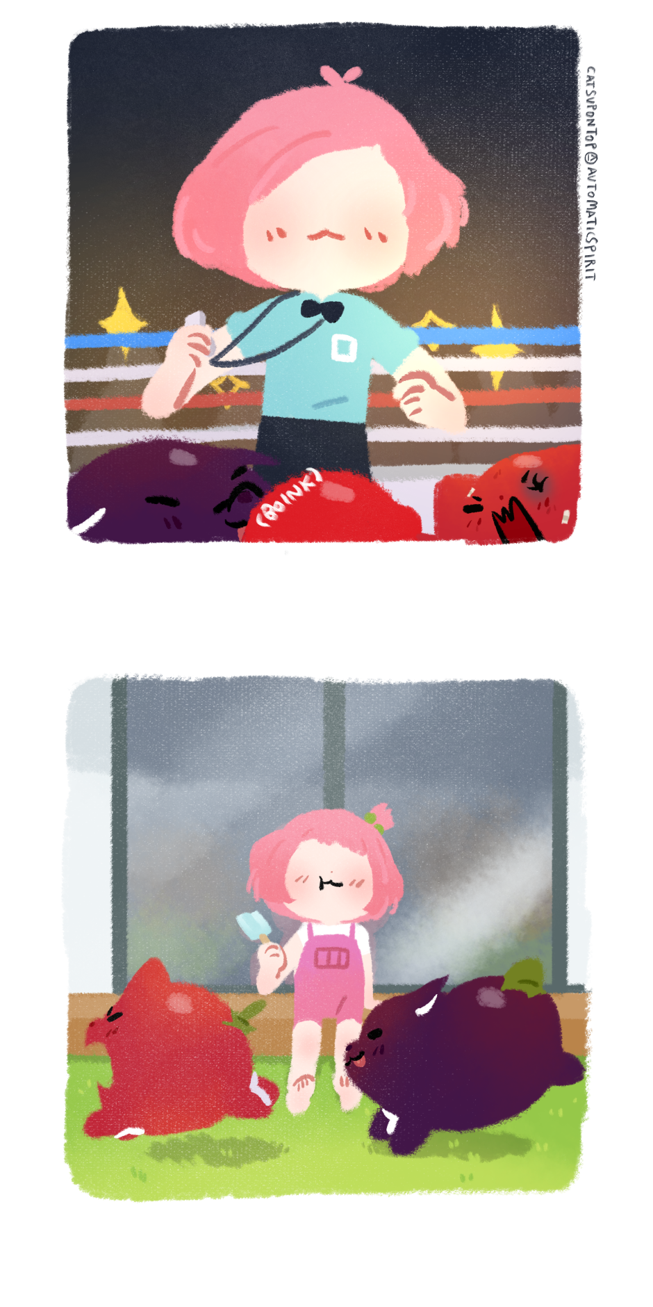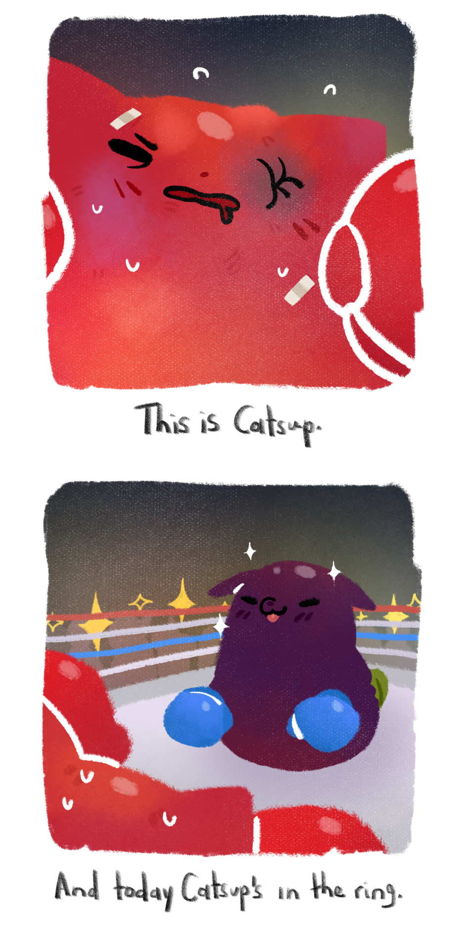 In the red corner: Catsup, and in the blue corner: Dobergine. I dunno if they're the same weight class- actually I know nothing about boxing, don't ask me.