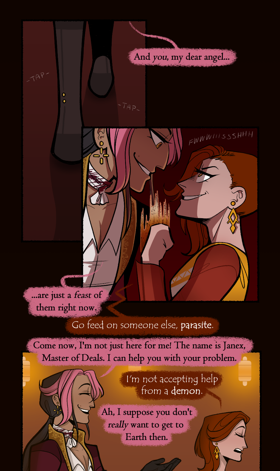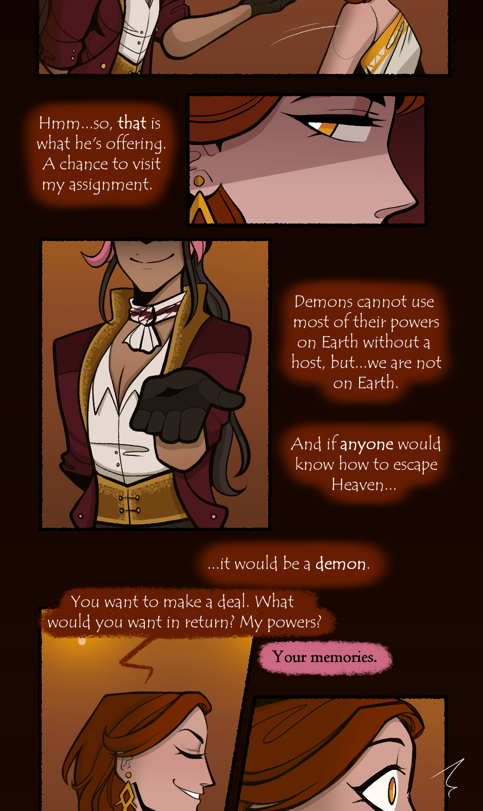 After introducing himself as Janex, Master of Deals, Onuspe realizes that Janex wants to offer him a deal that will let him visit his assignment on Earth. The cost of said deal? Onuspe's memories.