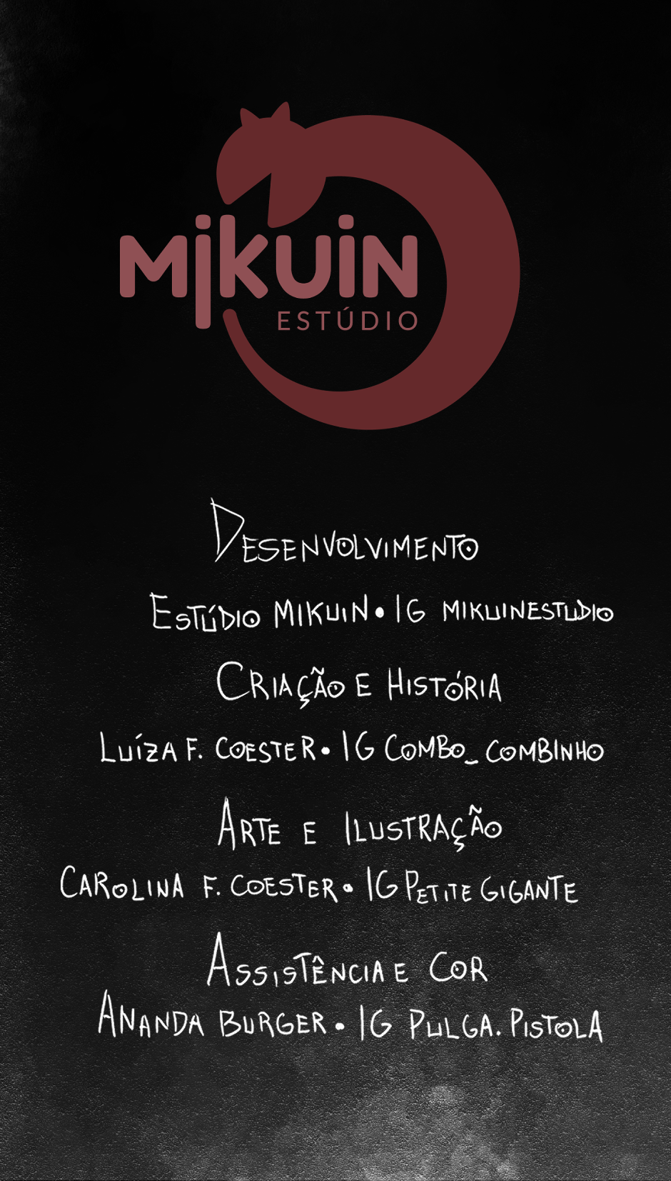 Equipe: Luíza F Coester | IG @combo_combinho - Criação e história - Roteirista chefe Carolina F Coester | IG @Petitegigante - Arte e ilustração - Colorista Chefe - Assistente de criação - Assistente de roteiro Ananda Burger | IG @pulga.pistola - Ilustradora assistente - Colorista assistente