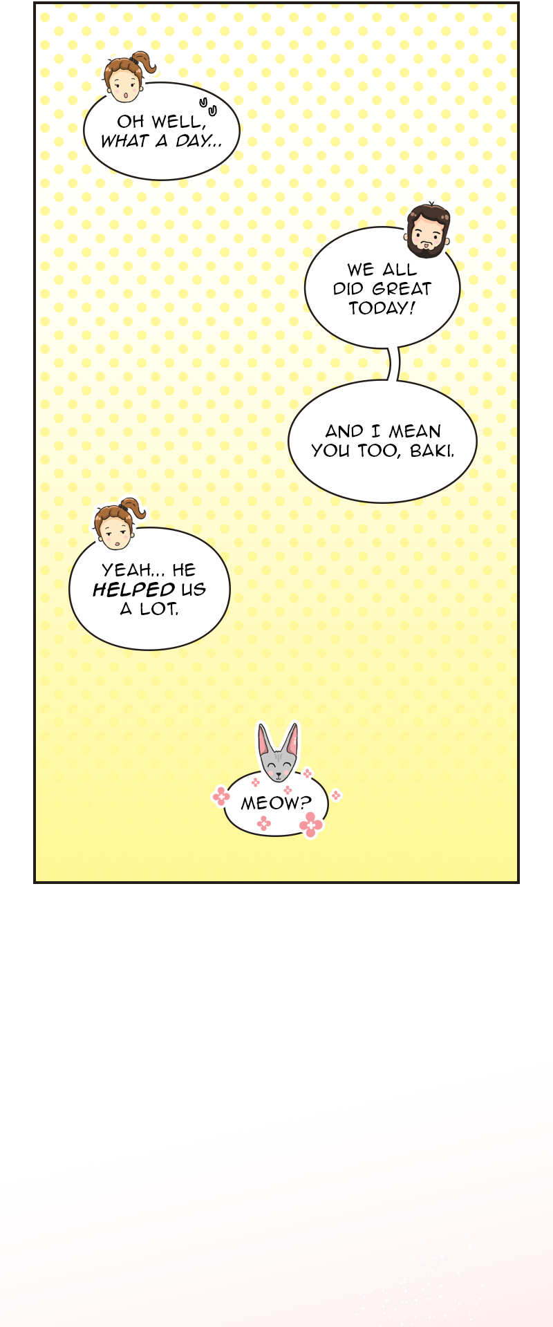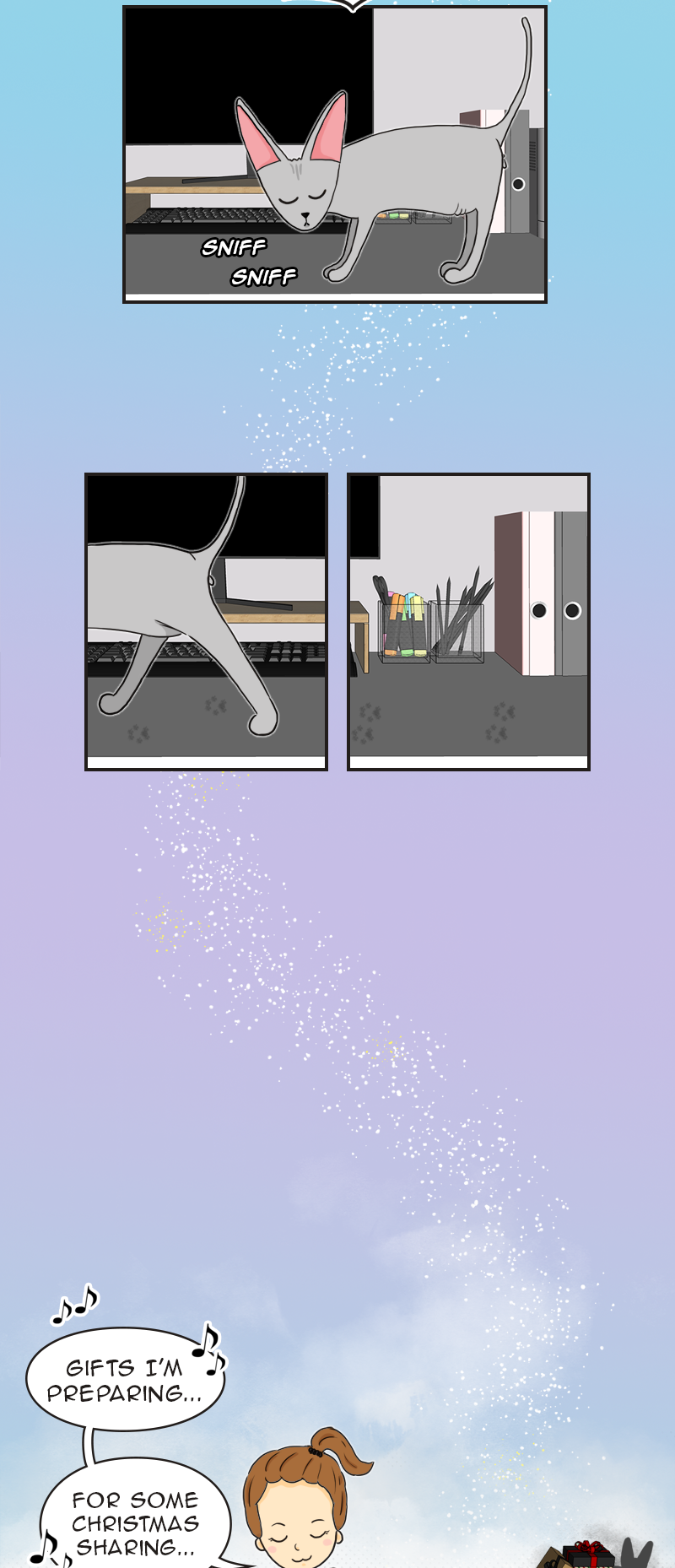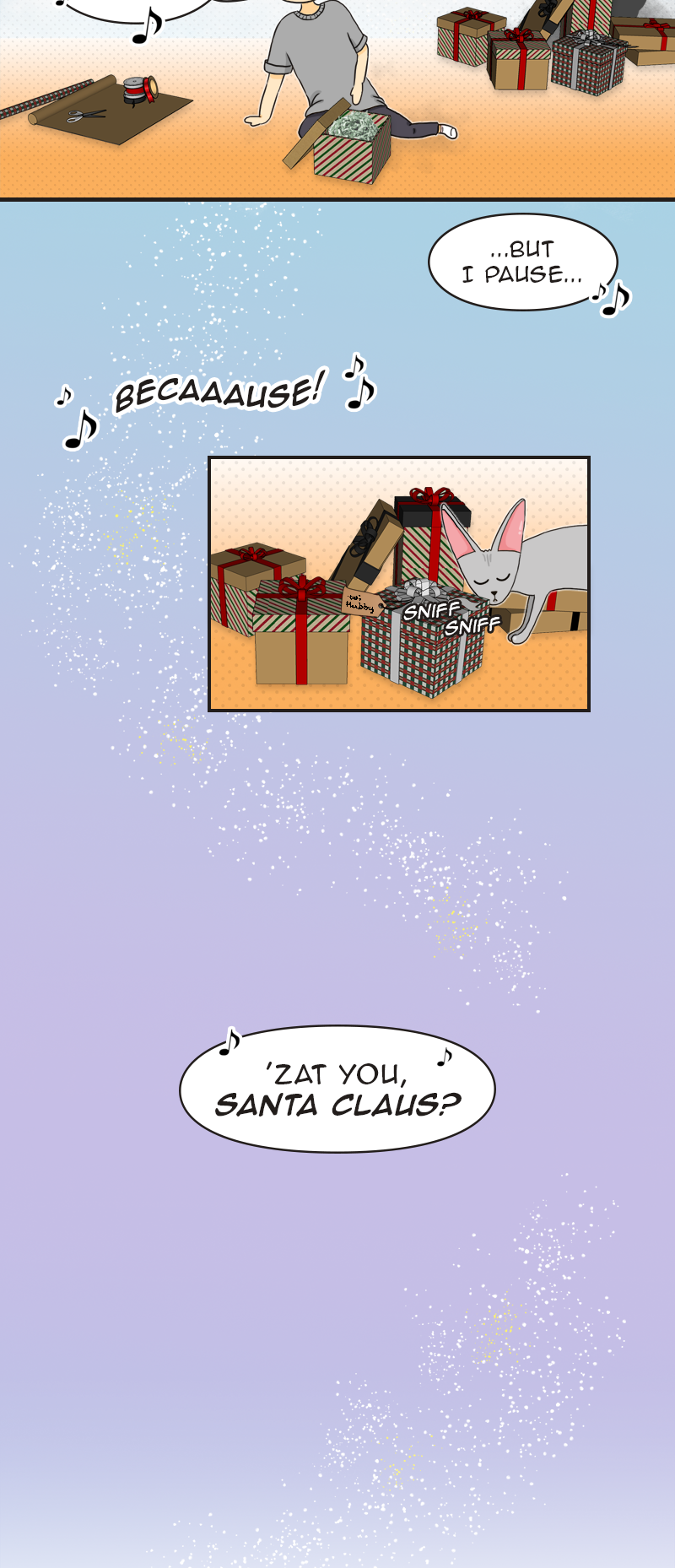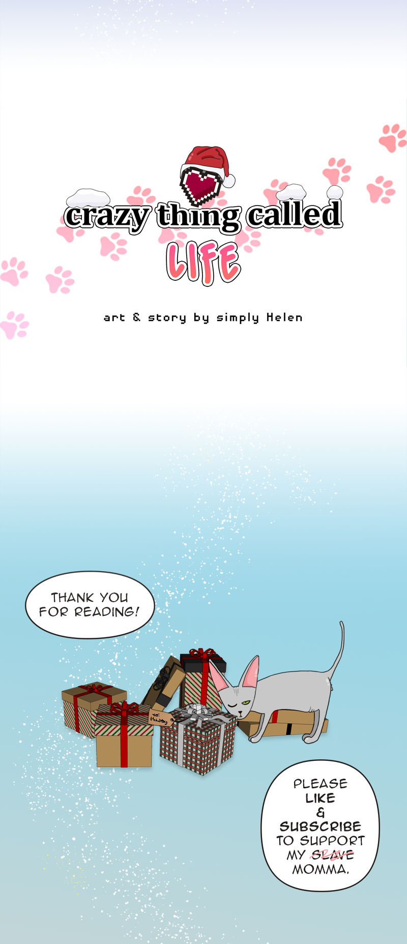 Imagine that you want to live a quiet and boring life... But you can't for the reason that you have a husband and a sphynx cat, whom you love and who sometimes drive you nuts with their antics. How to survive? Draw a comic about it! Join the story to get to know a charming cat, his human parents and stories created all around them.