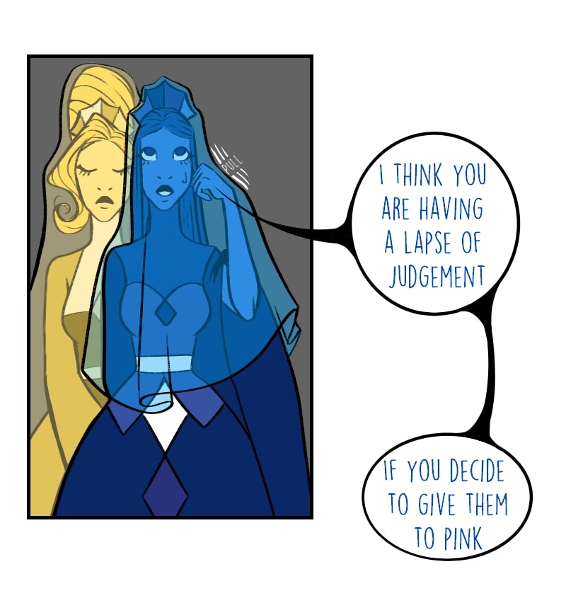 Note 1: This isn't the same universe, since here, Pink isn't depicted as a child, white does care about the other diamond, the do have a reason to invade other planets, and Yellow represents fear, Blue represents Power and Pink represents Care.