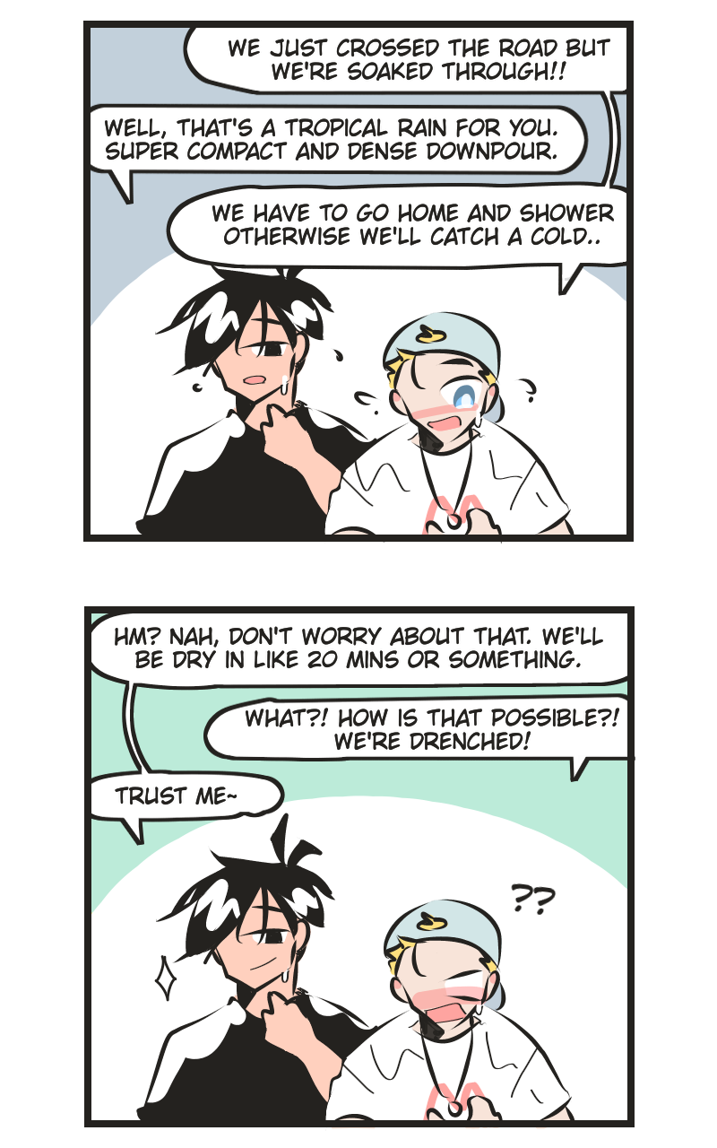 Rain in M Country is like gallons of water pouring down on you, loud rain soundtracks on your roof and thunder booming everywhere whereas rain in the Netherlands, even if it's 1/8 the heaviness of M Country's downpour, it'll already be flooded XD Also, happy 2022! Hope this year is better than the last! >.<