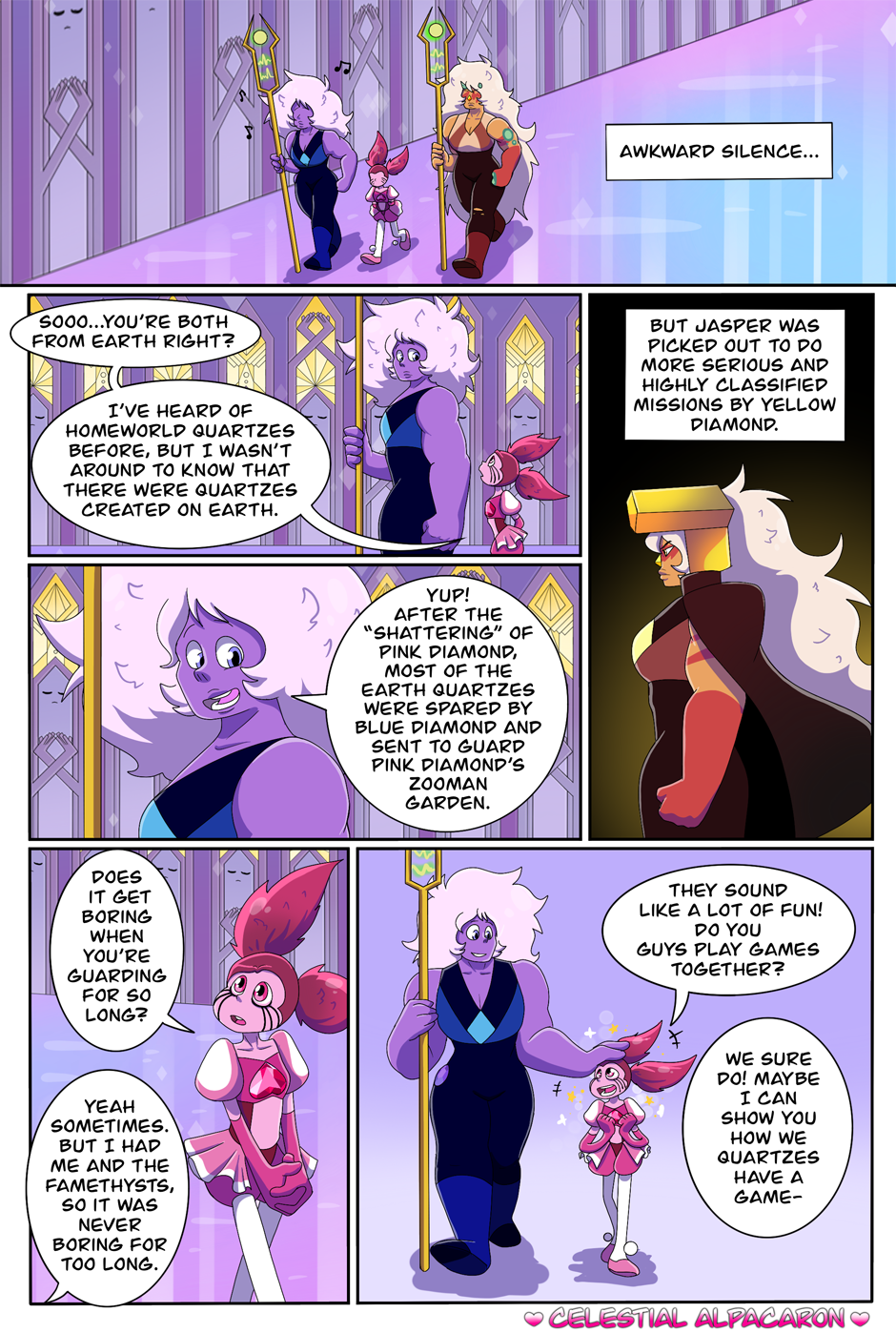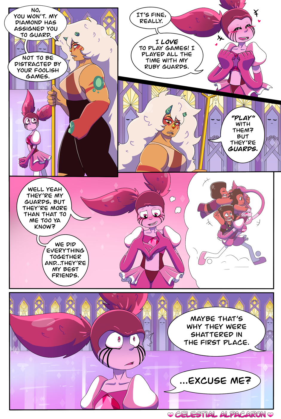 The Diamond Spinel AU comic is an alternative story, which takes place after Steven Universe the Movie and during the time of Steven Universe Future. Everything seemed great when Spinel first arrived at her new home, the Diamonds spoil her rotten and Spinel lived happily ever after with the Diamonds...or so Spinel wants to believe she is. It’s as if the Diamonds went back to their old and terrible habits, treating Spinel just like they had treated Pink. Spinel will have the choice to either give in and be exactly what the Diamonds want, or risk everything to be who she wants to be.