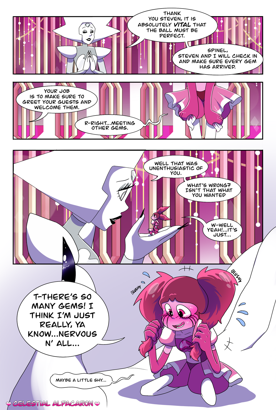 The Diamond Spinel AU comic is an alternative story, which takes place after Steven Universe the Movie and during the time of Steven Universe Future. Everything seemed great when Spinel first arrived at her new home, the Diamonds spoil her rotten and Spinel lived happily ever after with the Diamonds...or so Spinel wants to believe she is. It’s as if the Diamonds went back to their old and terrible habits, treating Spinel just like they had treated Pink. Spinel will have the choice to either give in and be exactly what the Diamonds want, or risk everything to be who she wants to be.