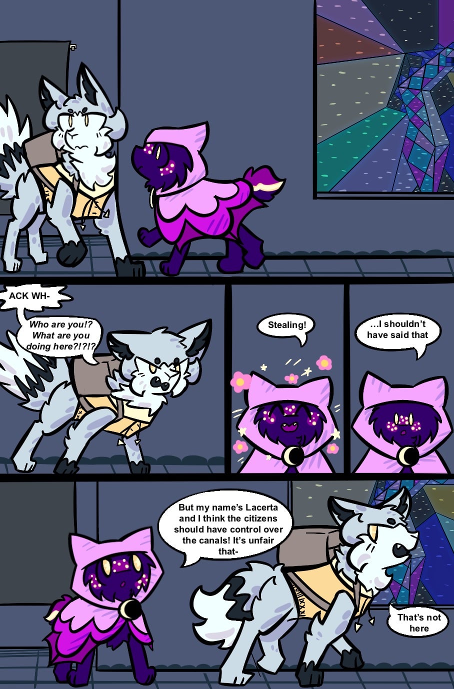 This comic has so much lore that will never be relevant ever. While I was drawing the stained glass in the background I ended up with lore about the glass industry, why that particular design is depicting it’s subject in that way, and how that specific panel was commissioned. On an unrelated note I smugly made the cuts in the piece practical without a glass saw, since I’ve done some stained glass projects and know how annoying it is
