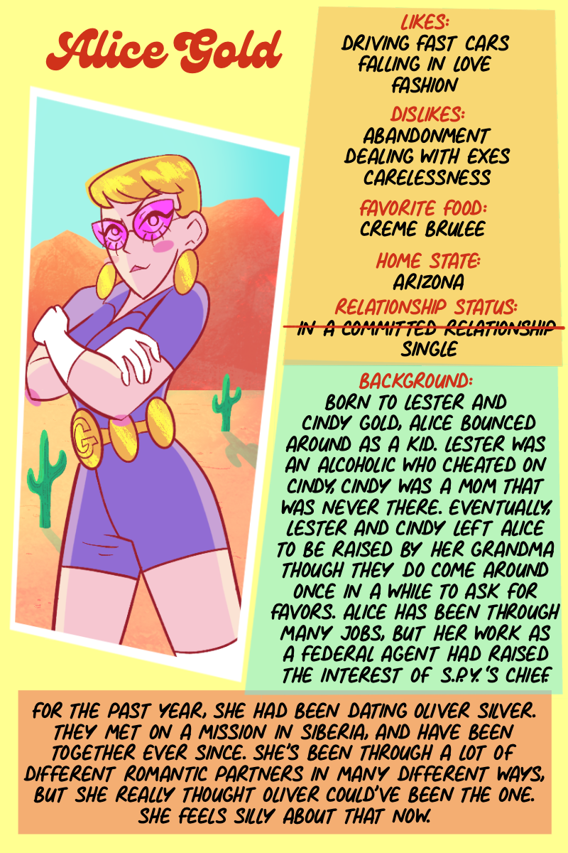 Alice Gold is the world's greatest spy. At S.P.Y. she teams up with a wide variety of agents to save the world. Can Alice fix her love life or is she better off riding into the sunset with the next agent? Updates Thursdays. Created by Savie S. & Brogan C.