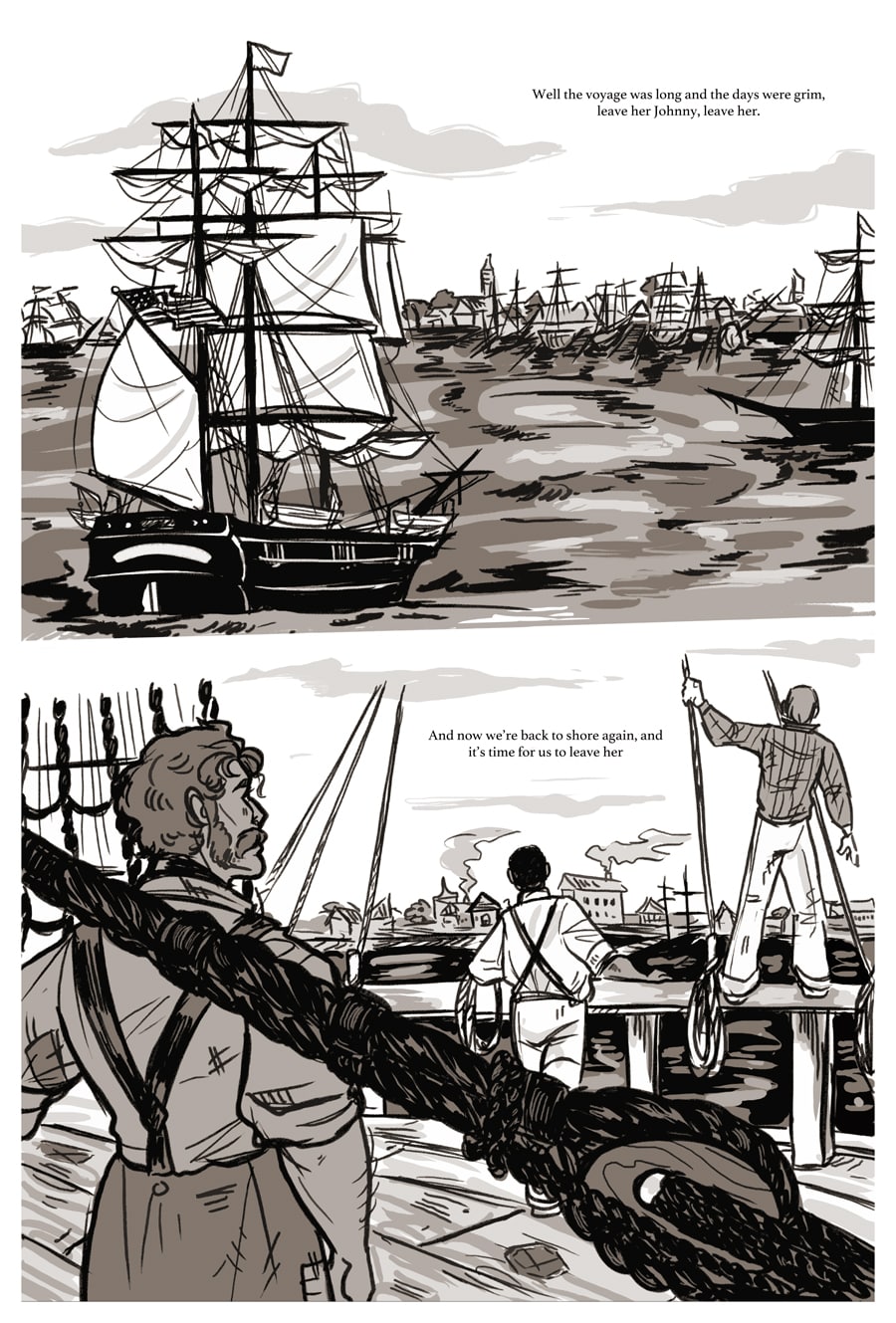 Panel 1 [Large panel of a ship out on the water coming into the port of New Bedford, lyrics overhead of a shanty sailors are singing]
