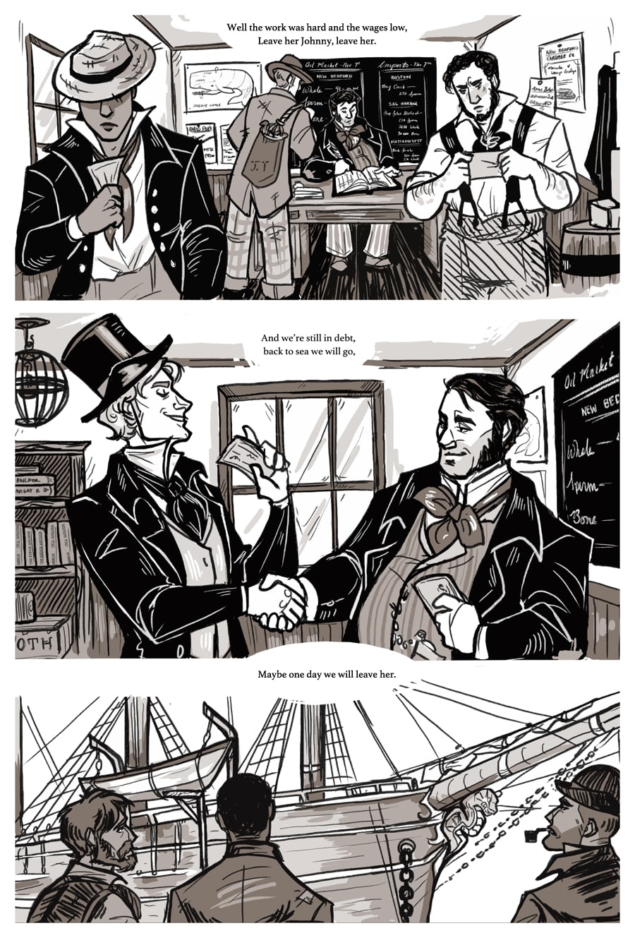 Panel 1 [Whalers stand in line in the shipping agent’s office receiving their pay, looking unhappy with it]