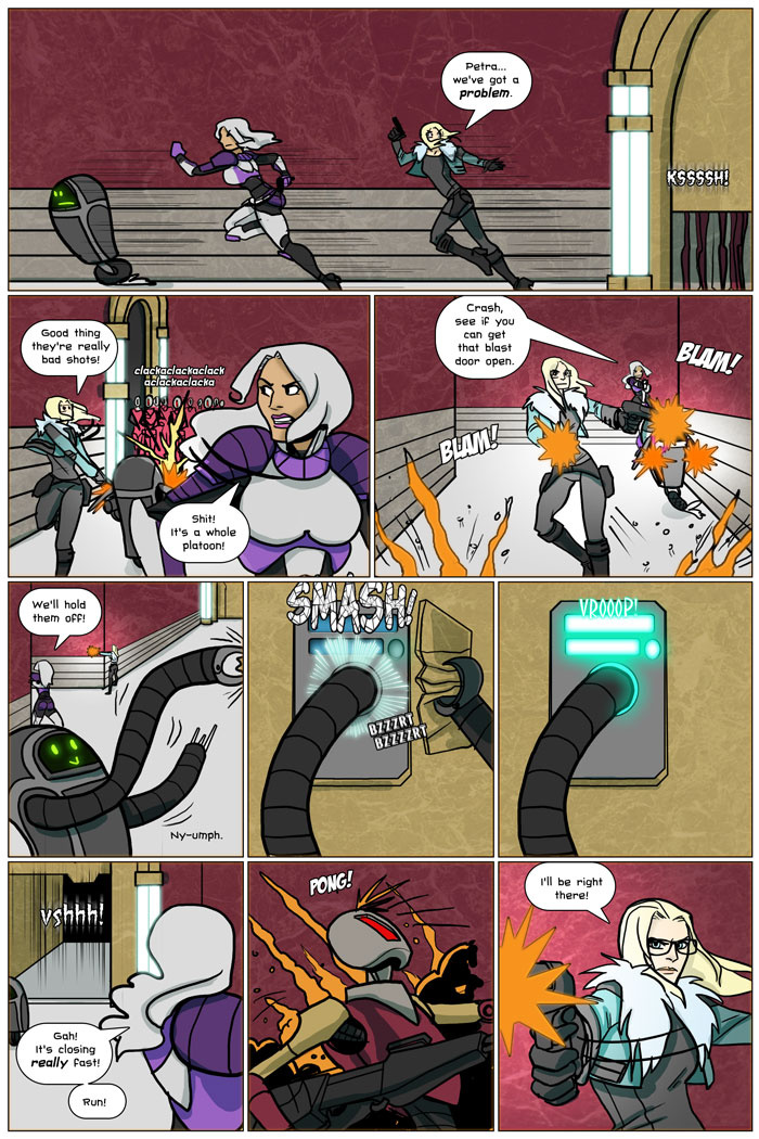 Petra, (along with Peach, Grey, Elizabeth, Pumpkin, Tumi, Glitch and Crash), is in the business of being alive. In her far flung future humans are tolerated at best, so you take what you get. Most of the time that means taking some more dangerous cargo from time to time.