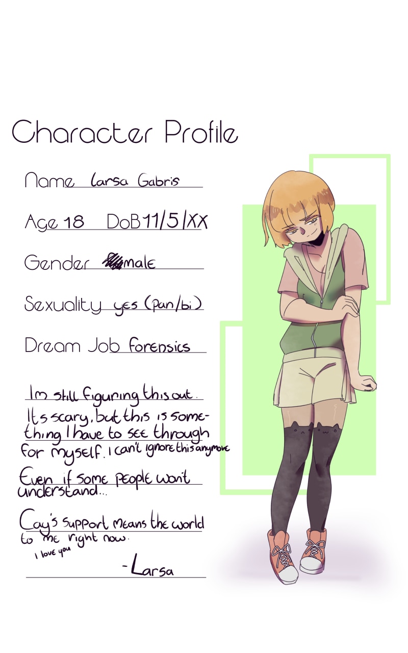 When Cayden's girlfriend Larsa comes out to him as trans, he isn't entirely sure what to say, do, or think. But he's sure of one thing. He still loves Larsa regardless and he wants to support him in every way he can through this transition-- though he does have to figure out what that means.