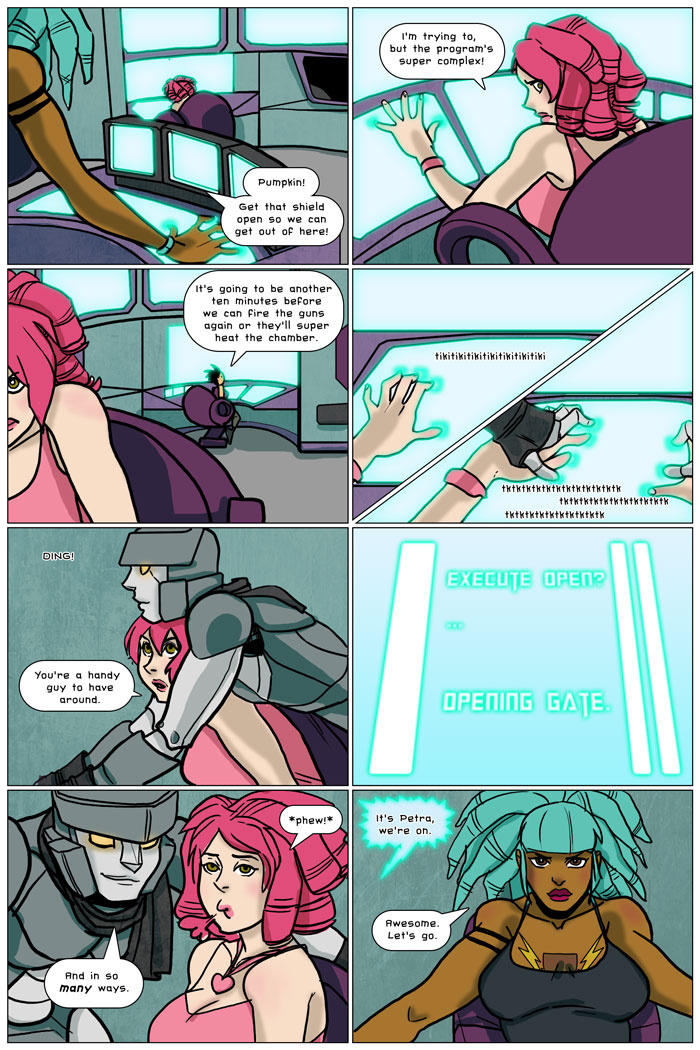Petra, (along with Peach, Grey, Elizabeth, Pumpkin, Tumi, Glitch and Crash), is in the business of being alive. In her far flung future humans are tolerated at best, so you take what you get. Most of the time that means taking some more dangerous cargo from time to time.