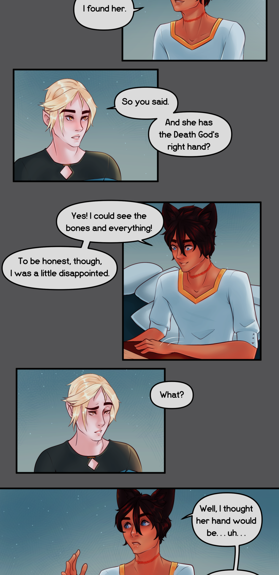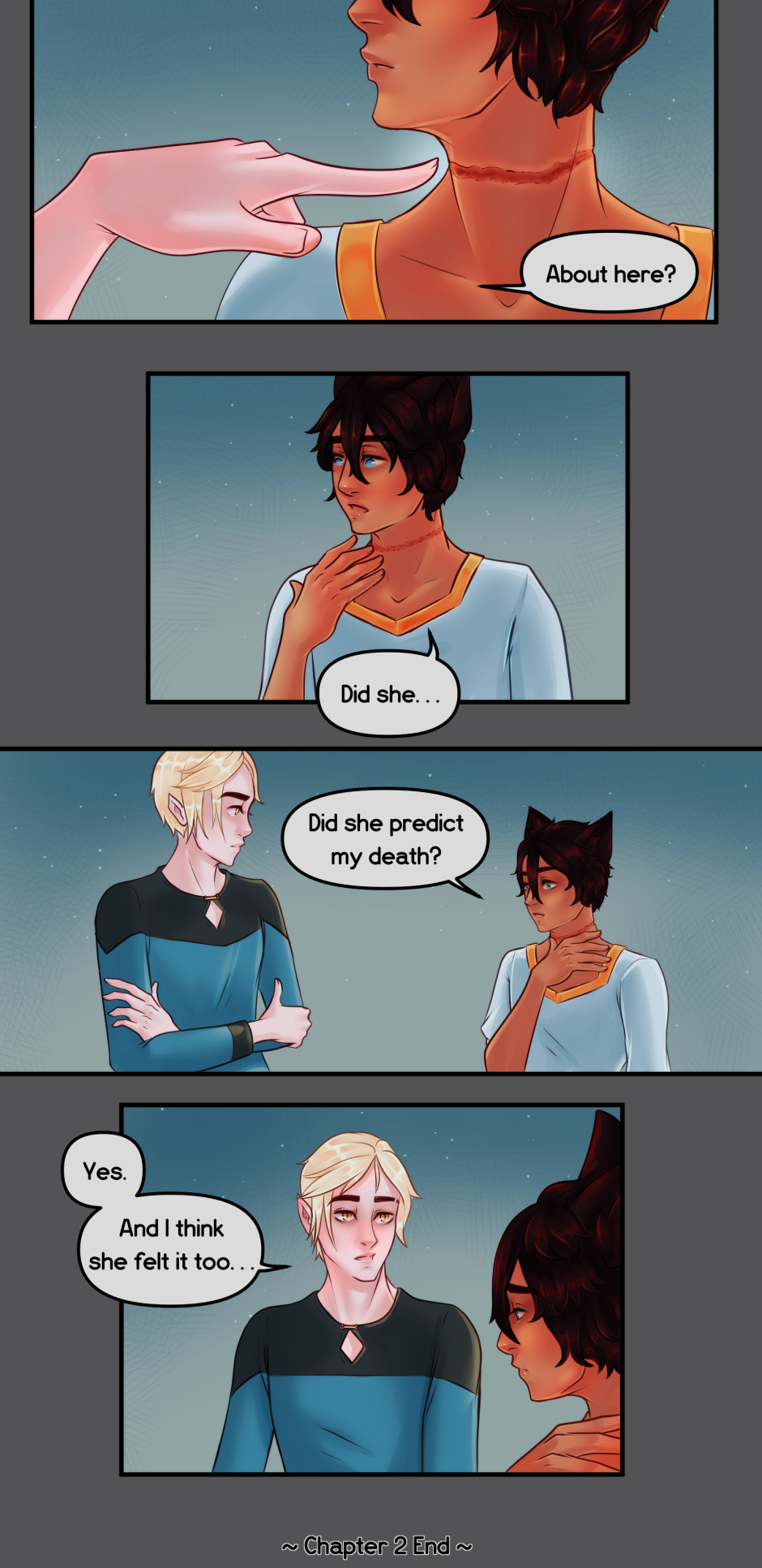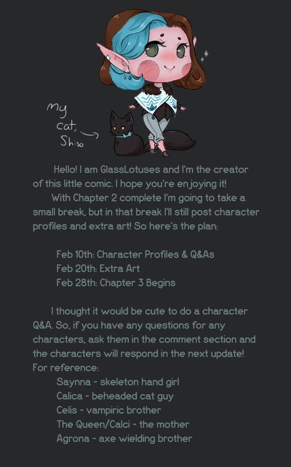 Woot 2 chapters down :D lol I need a little break now to build my buffer back up, I'll still be posting here and on Patreon. But yeah, any questions for the characters?